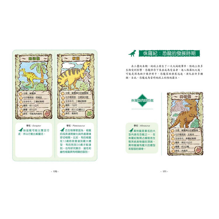 恐龍曾是陸地上有名的霸主,牠們的外型、習性都不一樣,書中以插畫加文字說明恐龍的誕生、演進史,透過名錄認識不同恐龍的資料和習性。還要經歷三疊紀、侏羅紀、白堊紀,看看各時期代表的恐龍有哪些、恐龍寶寶怎麼出生的、世界上有哪些知名博物館可以看到恐龍化石,以及專門研究恐龍的科學家小故事。