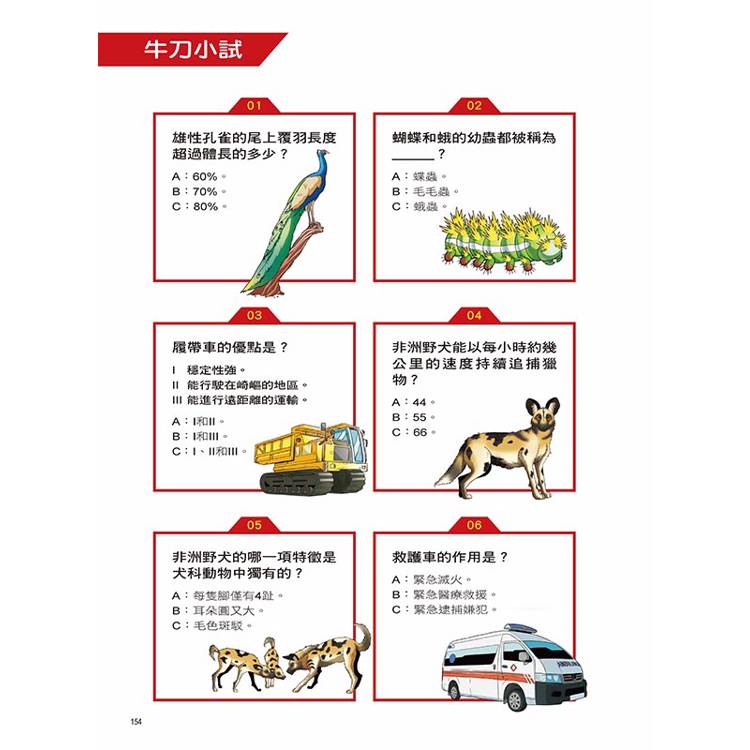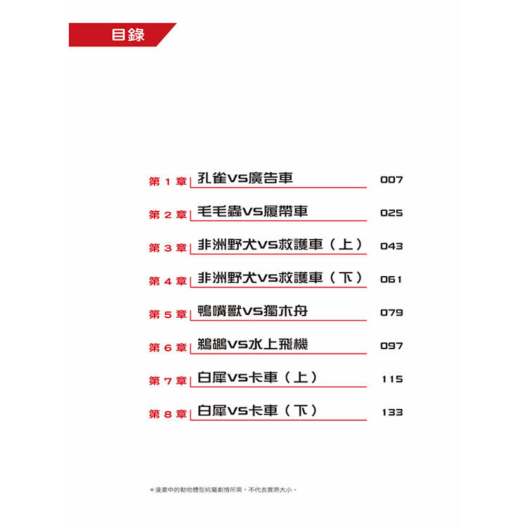 書中每個章節都設有「動物VS科技」小百科,藉由豐富的圖片和淺顯易懂的文字,詳細介紹華麗開屏的孔雀與聲光效果十足的廣告車如何瞬間成為目光焦點、毛毛蟲和履帶車的移動方式暗藏什麼祕密、非洲野犬及救護車各用哪種方式向同伴與人群示警、擅長游泳的鴨嘴獸及靈活移動的獨木舟有何相似之處、擁有堅硬利角的白犀與鋼鐵打造的卡車其實擁有驚人共同點等超炫知識,讓小朋友有系統的學習。