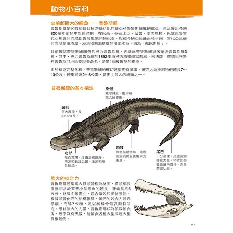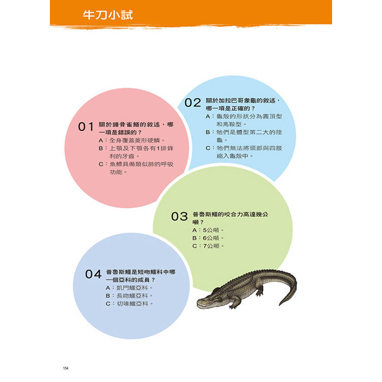 設有「動物小百科」單元,特別介紹大雀鱔屬動物、南美象龜屬動物和普魯斯鱷屬動物的構造與小常識,以及雙眼間有形似鏡架的橫骨而得名的眼鏡凱門鱷、依靠肢體語言辨認性別的黃腿象龜、會於旱季鑽入沼澤夏眠的佛羅里達雀鱔、背甲上有獨特放射狀花紋的緬甸星龜、將巢穴建在白蟻丘旁來讓自己保溫的錐吻古鱷等動物的超炫常識,讓小朋友有系統的學習。