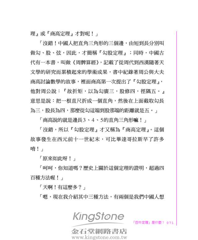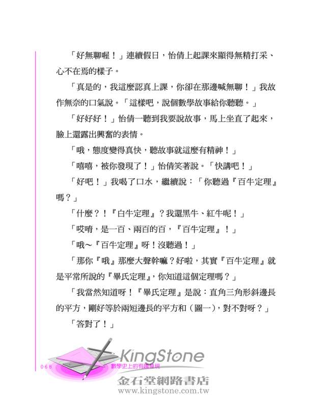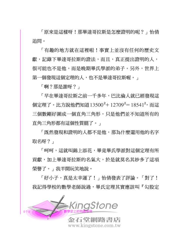 這是一本平易近人、豐富有趣,並完全有別於教科書的數學書籍,可以讓您與孩子輕鬆地認識數學史上的重要發現;在精彩的故事中習得 數學概念;在日常生活裡培養孩子對數學的興趣。相信您與孩子一定能從中得到愉快的閱讀以及學習經驗!