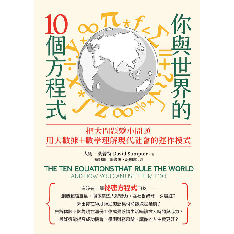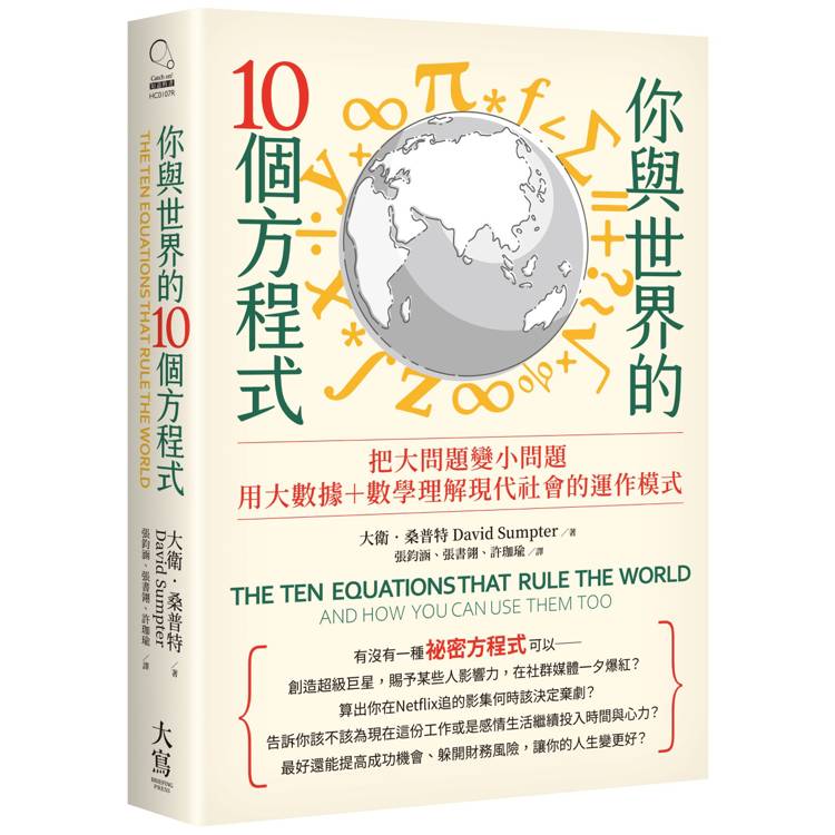 「這些方程式並非描述發條宇宙的演化,不像牛頓方程式和愛因斯坦關係式那樣清晰明朗。這些方程式講的是隨機性、期望和不完美的資訊,換句話說,就是在描述真實世界。大衛.桑普特引領你踏上一場愉快的數學之旅,改變你看待世界的方式。」──西恩.卡羅爾(Sean M. Carroll),《隱藏的宇宙》(Something Deeply Hidden)作者