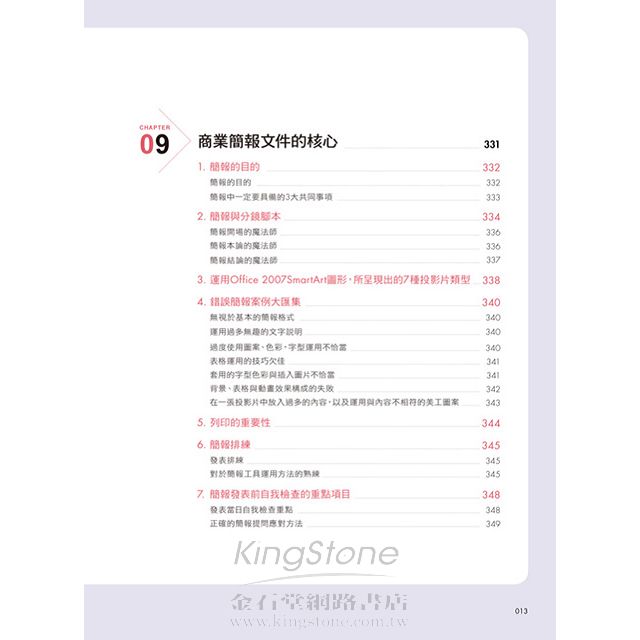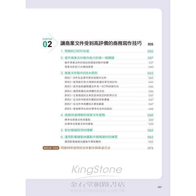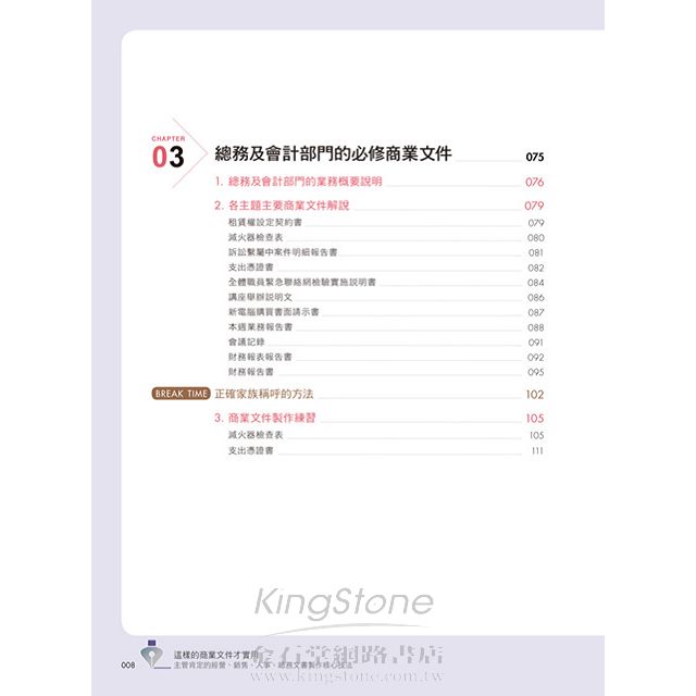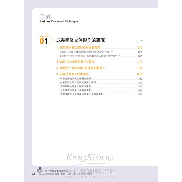 本書深刻化的內容安排,網羅公司內部各部門主要使用的商業文件,包含管理部門的新產品提案書、各部門協調公告;銷售部門的促銷活動報告、市占率分析;人事部門的在職證明書、教育訓練企劃,以及總務部門的採購申請書等等…。超過50套以上專業職場人必備的商業文件,在這裡將會一次讓您掌握到。