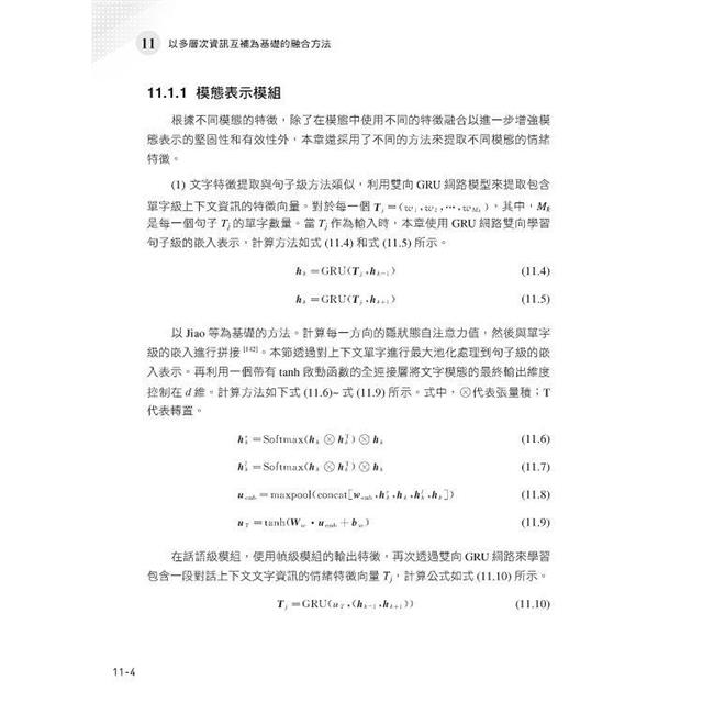 介紹了跨模態資訊的情感分析,包括跨模態特徵表示、多層次資訊互補的融合方法、生成式多工網路的情緒辨識方法以及面向對齊和非對齊序列的跨模態情感分類方法。