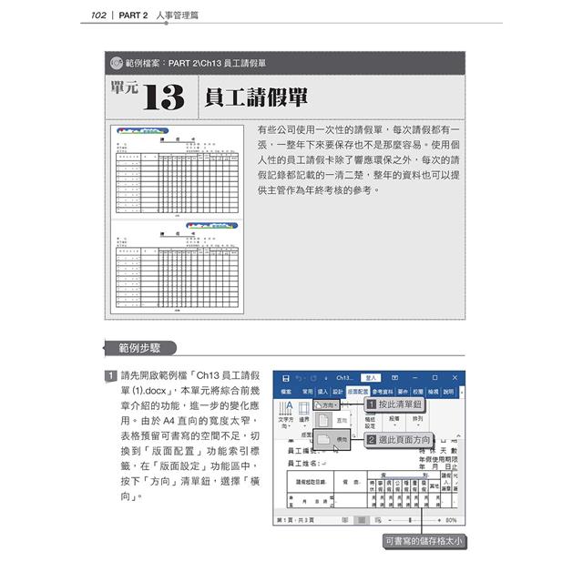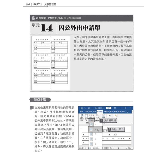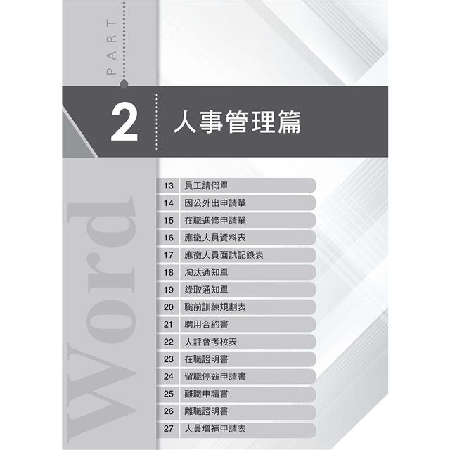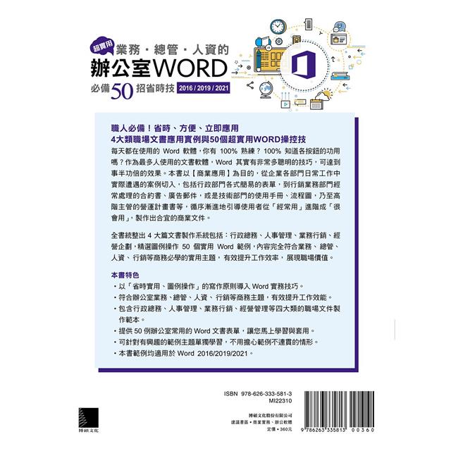 全書統整出4大篇文書製作系統包括:行政總務、人事管理、業務行銷、經營企劃,精選圖例操作50個實用Word範例,內容完全符合業務、總管、人資、行銷等商務必學的實用主題,有效提升工作效率,展現你的職場價值。