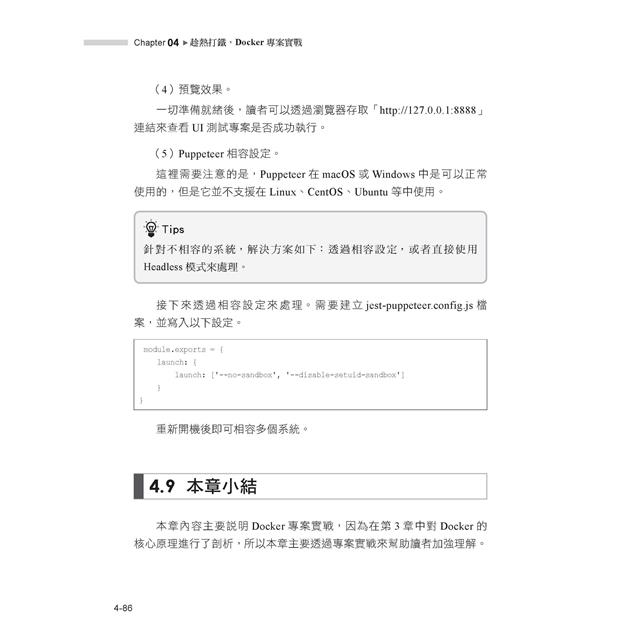 值得一提的是,本書案例均來自實際的研發專案,為了讓讀者能夠輕鬆掌握,去除了容器中包含的業務邏輯,保留了Docker的核心架構,實作性強。熟練掌握本書中的案例,沉澱其所表現出來的方法論,讀者一定能夠在企業應用中靈活運用,事半功倍。