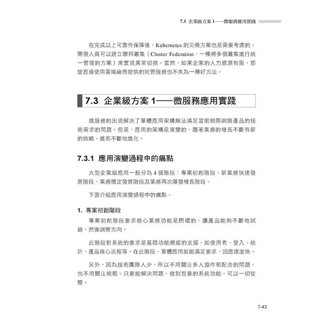 何謂“七步法”?“七”既是人們最容易記住的數字,也是人類瞬間記憶的極限,本書正是立意於此。第一步是從具象的故事開始,開門見山,降低認知門檻。第二步則透過“第一個Docker專案”,幫助讀者快速上手。在讀者建立起系統概念後,第三步則直切核心原理,圍繞Docker架構展開,由淺入深地講解Docker底層的隔離機制、容器的生命週期、網路與通訊、儲存原理及原始程式。深入剖析,“知其然而知其所以然”。第四步趁熱打鐵,圍繞前後端專案,從全端角度進行專案實戰。第五步則從Docker運行維護角度出發,進一步補充讀者的知識圖譜,這也是初學者最容易忽視的內容。從第六步開始就步入了高級應用,該部分重點圍繞Docker技術最佳實踐展開,提供了容器與處理程序、檔案儲存與備份、網路設定、鏡像最佳化及安全性原則與加固等內容,案例豐富,操作性強。第七步則昇華全書內容,透過雲端原生持續交付模型、企業級容器化標準及兩個實際的企業級方案,串聯本書所有內容。