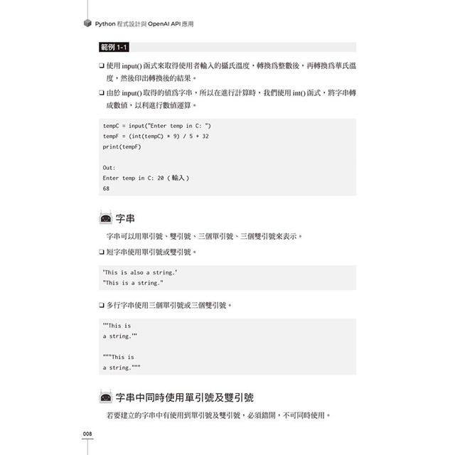 本書內容的安排由淺入深,對Python程式設計進行系統性的介紹,並詳細說明OpenAI API的應用。本書以程式範例來說明Python程式設計的概念,可有效幫助讀者的學習,並經由實作的過程,建構專屬非同步GUI版的語音聊天機器人。