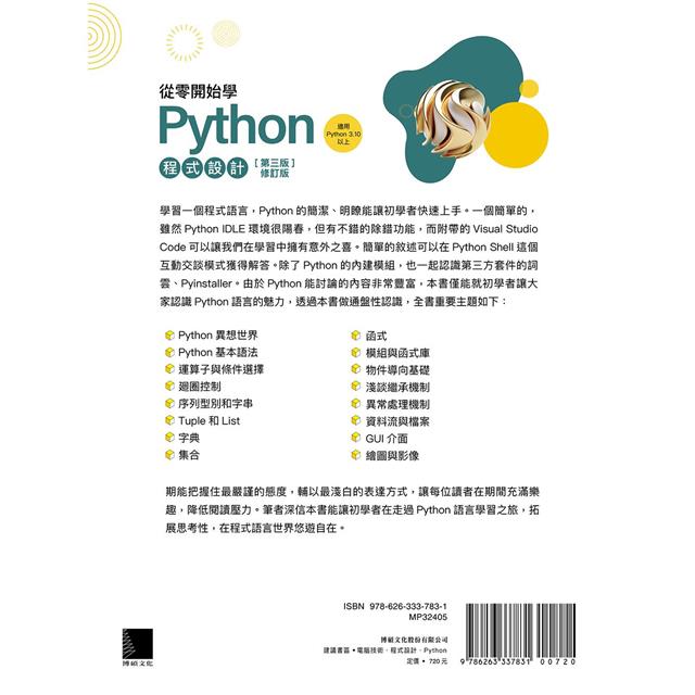 期能把握住最嚴謹的態度,輔以最淺白的表達方式,讓每位讀者在期間充滿樂趣,降低閱讀壓力。筆者深信本書能讓初習者在走過 Python 語言學習之旅,拓展思考性,在程式語言世界悠遊自在。