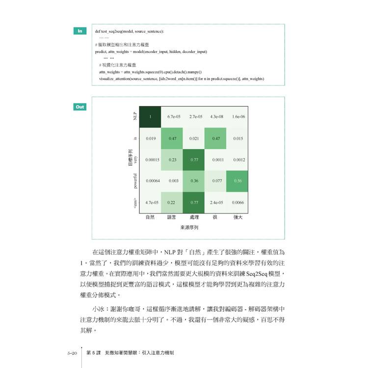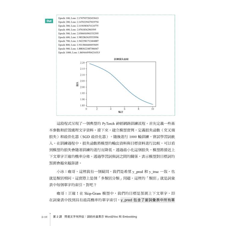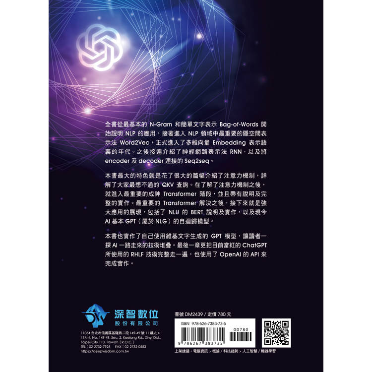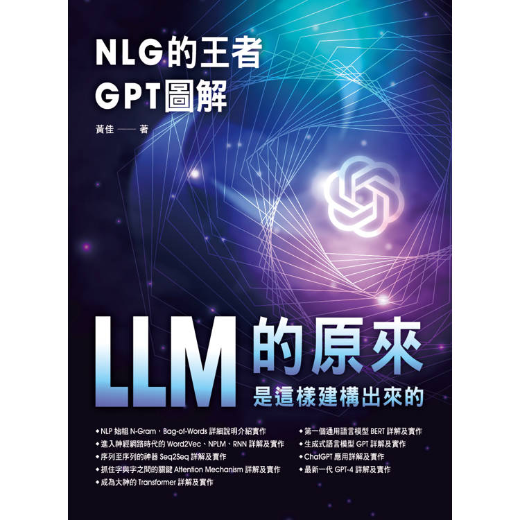 全書從最基本的N-Gram 和簡單文字表示Bag-of-Words開始說明NLP的應用,接著進入NLP領域中最重要的隱空間表示法Word2Vec,正式進入了多維向量Embedding表示語義的年代。之後接連介紹了神經網路表示法RNN,以及將encoder及decoder連接的Seq2seq。本書最大的特色就是花了很大的篇幅介紹了注意力機制,詳解了大家最想不通的QKV查詢。在了解了注意力機制之後,就進入最重要的成神Transformer階段,並且帶有說明及完整的實作。最重要的Transformer解決之後,接下來就是強大應用的展現,包括了NLU的BERT說明及實作,以及現今AI基本GPT(屬於NLG)的自迴歸模型。本書也實作了自己使用維基文字生成的GPT模型,讓讀者一探AI一路走來的技術堆疊。最後一章更把目前當紅的ChatGPT所使用的RHLF技術完整走一遍,也使用了OpenAI的API來完成實作。