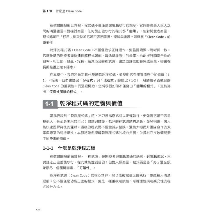 閱讀建議:第一次可順讀第 1 ~ 6 章,建立共同語言與基礎觀念。接著依團隊痛點挑選章節深入,例如先把測試與日誌補齊,再推動重構與模組化。若你是技術主管,亦可將章節作為 Code Review 與新人成長的對照清單,逐步形成團隊的「乾淨文化」。