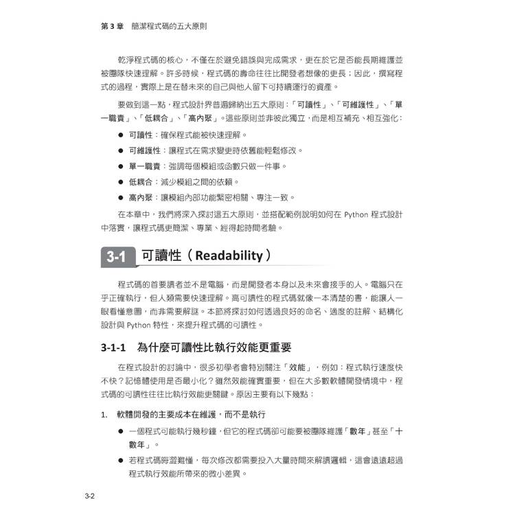寫程式不是比誰先跑起來,而是能否長期維護。當需求一改就骨牌倒、長函式與巢狀條件像毛線球、沒有測試誰也不敢動,這些都是「技術債」。本書以實務為軸,從Clean Code 的定義、Pythonic 寫法、命名與文件、PEP 8 與工具鏈、函數與物件設計、模組化結構、單元測試、例外處理與 logging,到壞味道識別與小步重構,一步步把專案從混亂導向清晰與可持續。