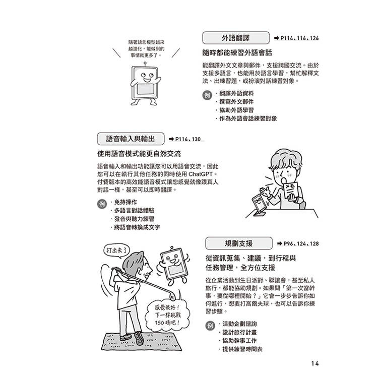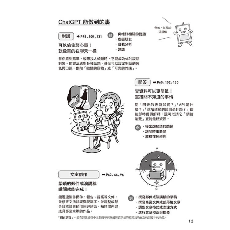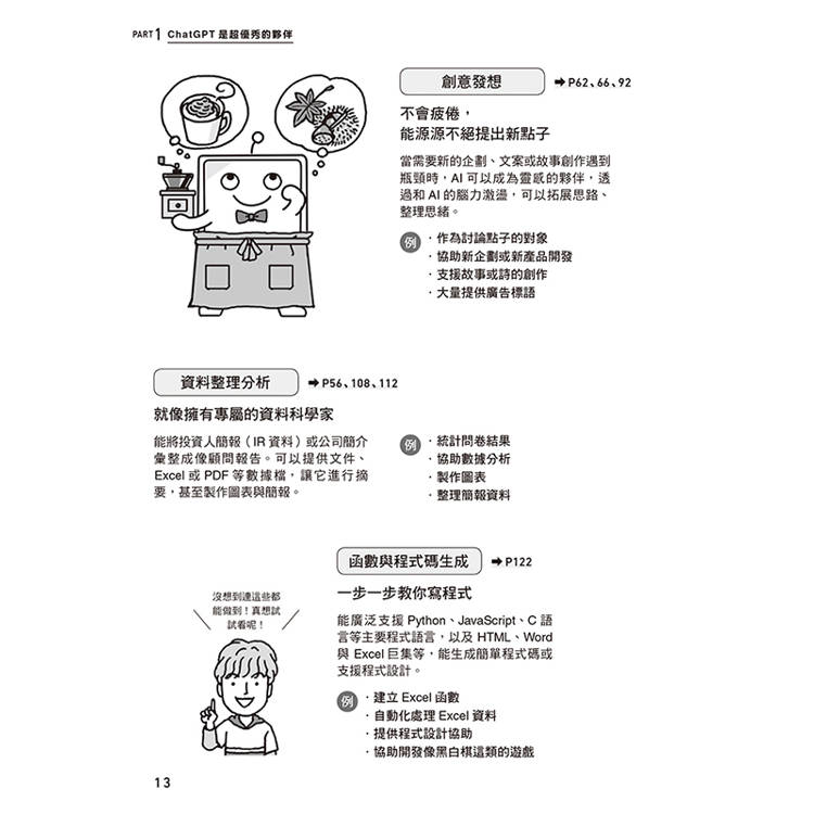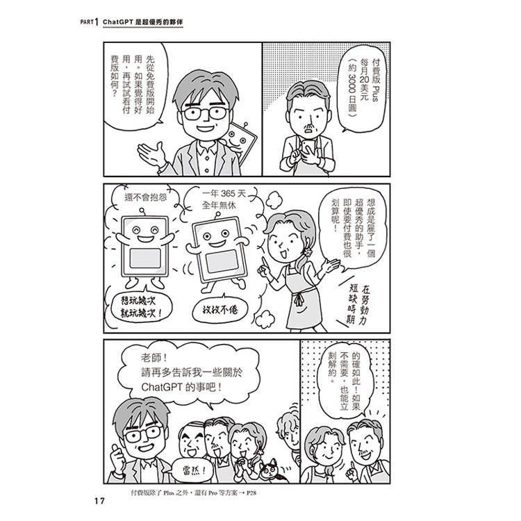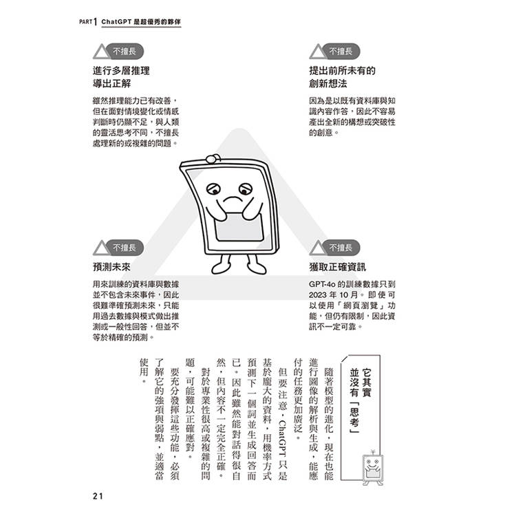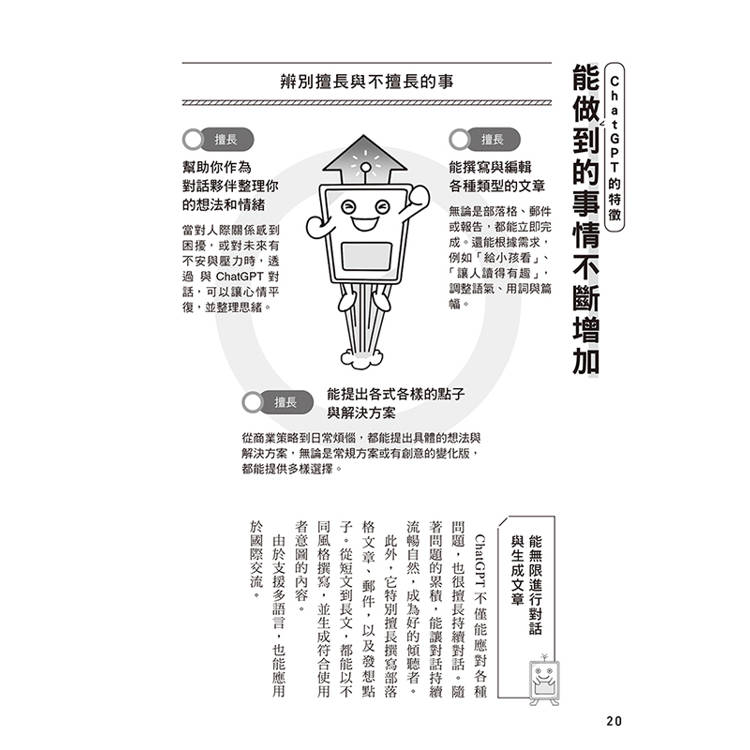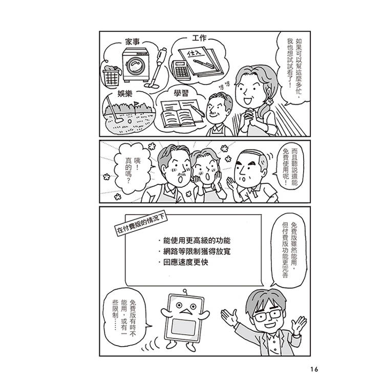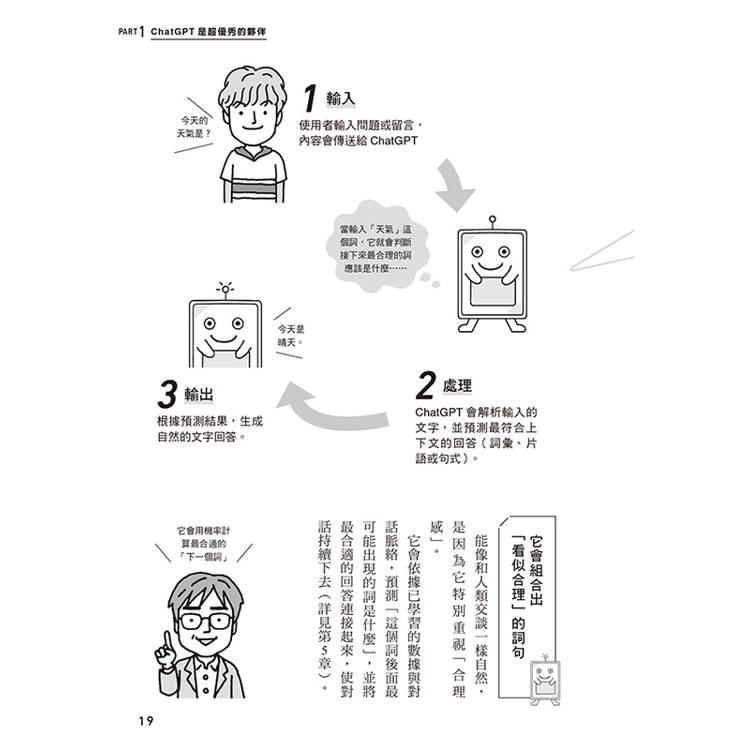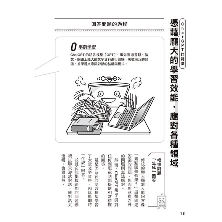 說明 ChatGPT 的基本性質與優勢。它是一種基於 GPT 語言模型的對話型 AI,能夠回答問題、生成文章、進行多語言交流,甚至參與規劃與創作。作者透過漫畫和案例,展示了 ChatGPT 在生活中扮演的角色,如家務助手、商店經營的幫手或日常對話的夥伴。內容也比較了 ChatGPT 與傳統聊天機器人的不同:前者能即時生成新穎的回答,而不只是依靠固定規則。書中同時提醒讀者,雖然它表現自然,但仍只是透過概率計算生成語句,並非真正理解。