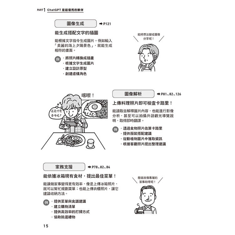 展示了 ChatGPT 在日常生活的實際應用。舉例來說,輸入家中現有的食材,即可獲得合適的晚餐菜單與烹飪步驟;透過房間照片上傳,能得到收納與整理的具體建議;甚至可生成掃除分工表,協助家庭成員公平分配任務。此外,還能協助撰寫二手交易的商品文案、分析家計支出、提供節約方法,成為虛擬理財顧問。章節中特別強調,ChatGPT 不僅能提出方案,還能依據用戶的回饋進行調整,讓日常生活更加舒適高效。