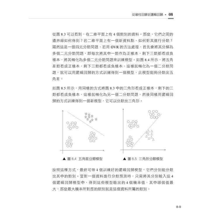 本書共分 13 章,系統講解機器學習的典型演算法,內容包括機器學習概述、資料特徵提取、scikit-learn 估計器分類、單純貝氏分類、線性回歸、k 近鄰演算法分類和回歸、從簡單線性回歸到多元線性回歸、從線性回歸到邏輯回歸、非線性分類和決策樹回歸、從決策樹到隨機森林、從感知機到支援向量機、從感知機到類神經網路、主成分分析降維。