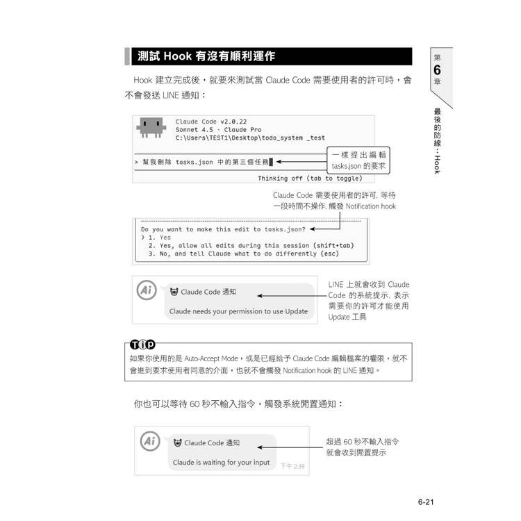 Claude Code 可以在工作流程中透過 Hook 發送通知,書中會展示如何串接 Hook,透過系統的桌面通知或是台灣人人都在用的 LINE 傳送通知,即使要求 Claude Code 進行任務後跑到茶水間喝杯咖啡,也可以在任務完成後從手機收到通知。另外,書中也會展示在我們既想要信任 Claude Code 自動修改、又想要在動到關鍵檔案時把關時,透過 Hook 建立最後一道防線。