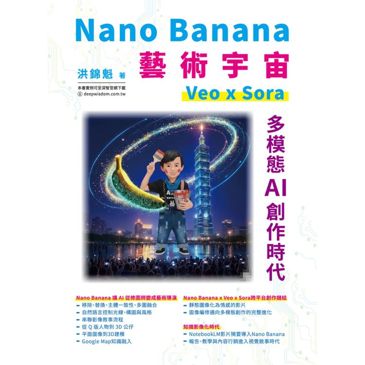 《Nano Banana 藝術宇宙》延伸自筆者在多模態 AI 研究的多年經驗,系統化地呈現從「影像編修」、「風格轉換」、「構圖融合」、「Q版人物到3D 公仔」、「3D 建模」、「AI 地圖創作」,到最終以 Veo 與 Sora 轉化為影片的完整創作鏈。這本書不僅介紹技巧,更探討「創意在 AI 時代的重構」: