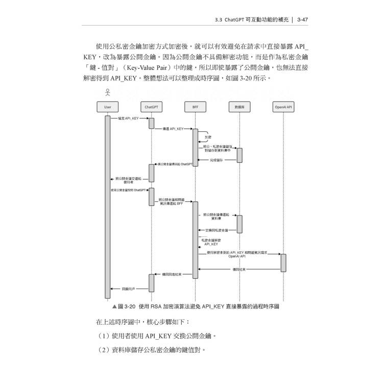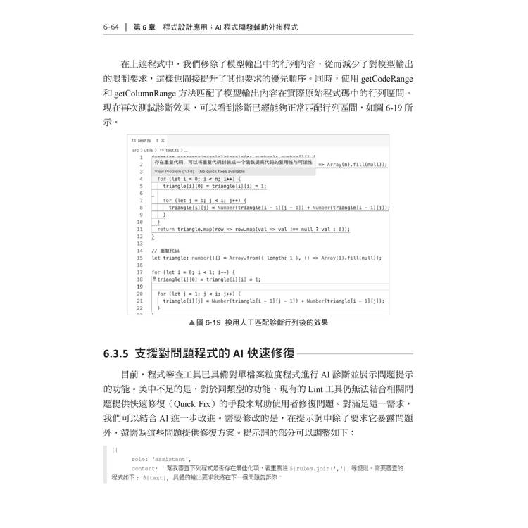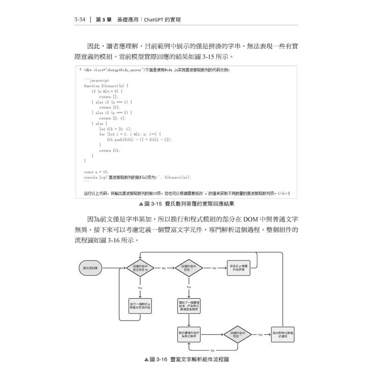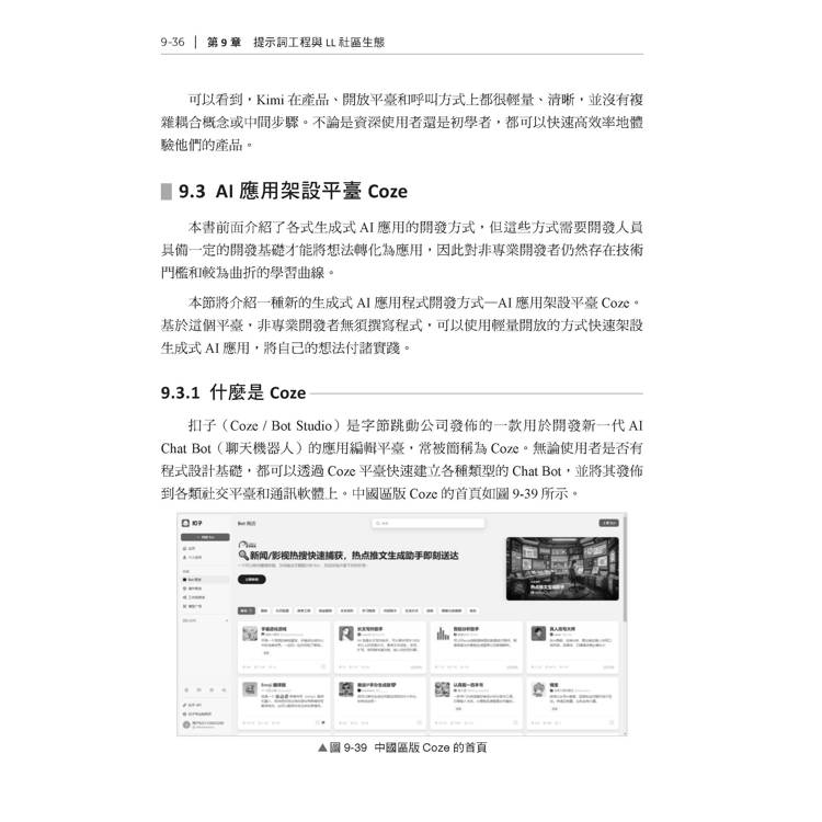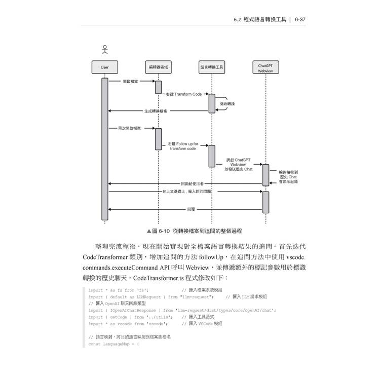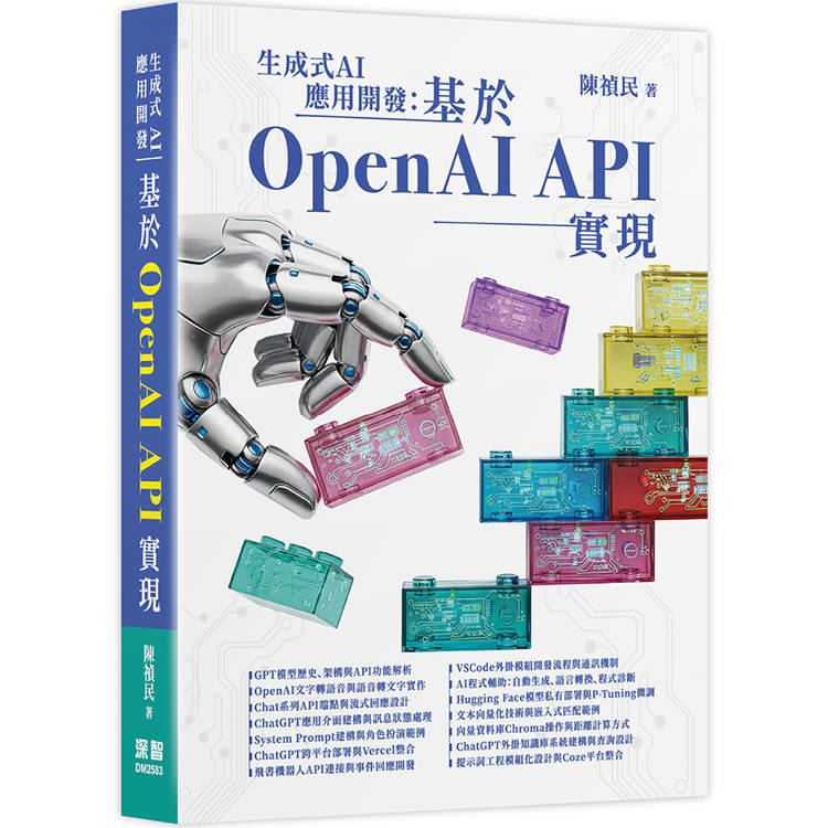 第一章介紹GPT模型歷程、原理與API介面。第二章說明OpenAI文字與語音轉換功能、API端點設計與請求庫封裝。第三章展示ChatGPT應用構建,包括互動區域、聊天快取與角色設定。第四章實作飛書機器人與OpenAI結合,開發多種回應與通知功能。第五章說明VSCode外掛程式開發流程與Webview通訊技術。第六章實作AI程式輔助模組,包含語言轉換、程式診斷與自動修復。第七章說明如何部署ChatGLM等開源模型與進行P-Tuning微調。第八章介紹RAG技術,實作文字向量化與Chroma向量資料庫整合,建構查詢式知識庫。第九章為提示詞工程與LLM社群工具介紹,說明提示詞模式、模型回應最佳化與Coze平台應用。