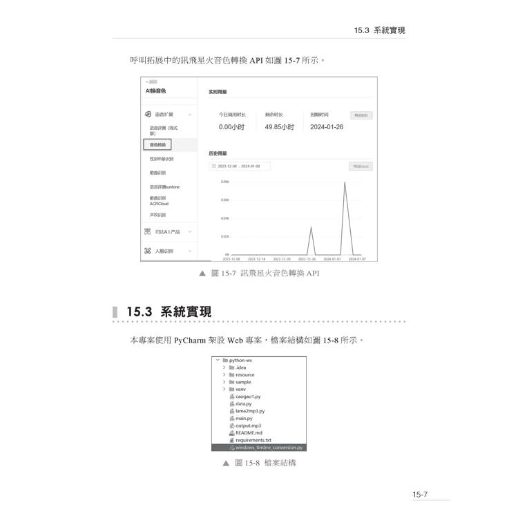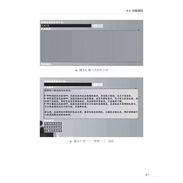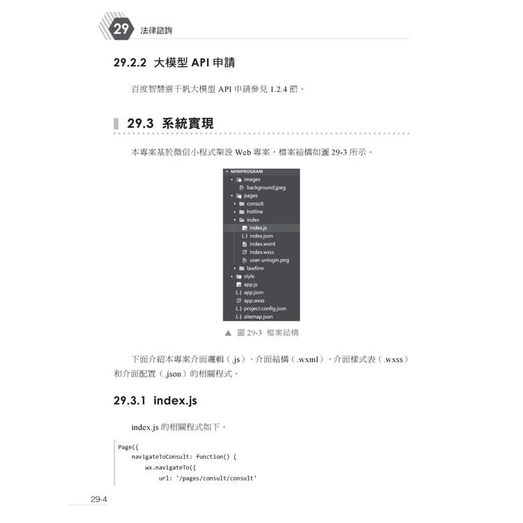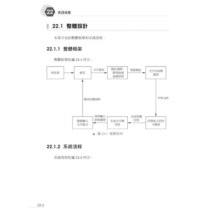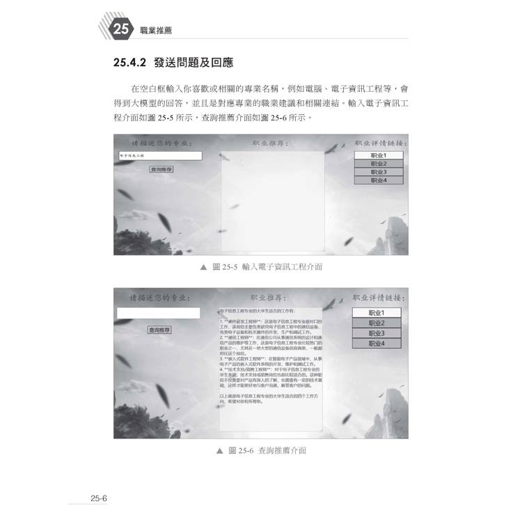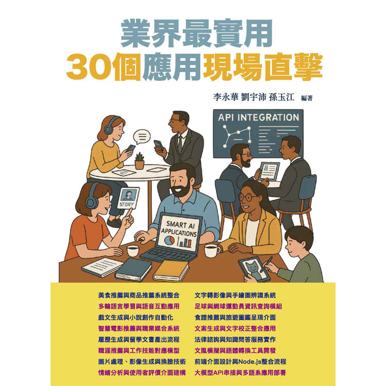 第一章介紹美食推薦系統,實作隨機推薦功能;第二章為語言學習平台,結合大模型進行語言對話;第三章為戲文生成工具,自動產出劇情內容;第四章為智慧電影推薦,整合演算法與GUI介面;第五章為影像處理應用,包含影像增強與生成;第六章設計職業匹配系統,分析履歷並提供建議;第七章實作簡歷生成工具,自動填寫履歷內容;第八章為產品推薦系統,根據輸入條件推薦商品;第九章開發文字互動小說專案;第十章為小說創作平台,自動續寫故事內容;第十一章為情緒分析工具,可解析用戶情緒傾向;第十二章實作文字轉影像工具;第十三章提供足球賽事資訊;第十四章為圖書館檢索系統;第十五章為音色轉換工具;第十六章實作智慧換臉應用;第十七章協助撰寫留學文書;第十八章開發寵物照護小幫手;第十九章分析使用者評價內容;第二十章為旅遊地點圖鑑查詢;第二十一章為文案生成助手;第二十二章為菜譜推薦平台;第二十三章為文字校正工具;第二十四章提供網球運動員資訊;第二十五章設計職業推薦系統;第二十六章建構職場知識問答平台;第二十七章為手繪圖像辨識;第二十八章為文獻閱讀助手;第二十九章開發法律諮詢小程式;第三十章實作文風模擬應用。