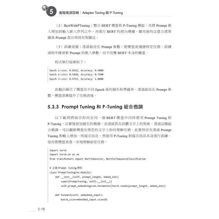 第5~10 章將深入探討如何最佳化與微調大模型。第5 章詳細講解了Adapter Tuning、P-Tuning 等微調方法,使模型能夠更進一步地適應不同任務需求;第6~8 章覆蓋資料處理、混合精度與分散式訓練、對比學習和對抗訓練等技術,幫助讀者在有限資源下高效提升模型性能;第9、10 章則專注於最佳化策略,介紹AdamW、LAMB 等自我調整最佳化器和動態學習率排程,並探討知識蒸餾與剪枝技術如何在不犧牲性能的情況下減少計算需求,從而使大模型的應用更加廣泛。