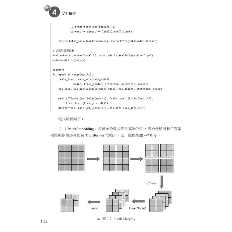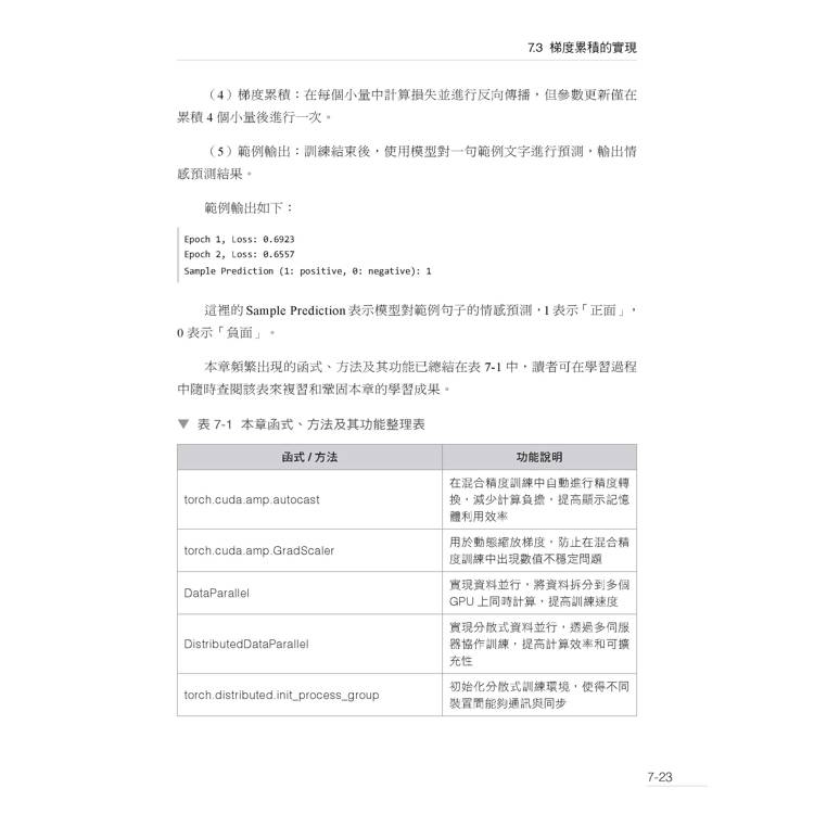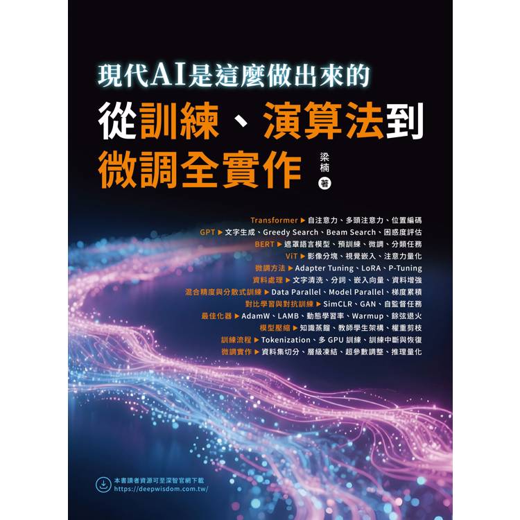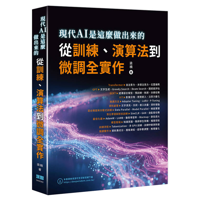 第一章介紹Transformer的基本原理,包括自注意力、多頭注意力與位置編碼。第二章說明GPT模型的文字生成機制與實作方法,並比較Greedy與Beam Search等生成策略。第三章講解BERT模型的編碼結構與遮罩語言模型任務,並說明如何應用於分類任務。第四章介紹ViT模型在影像分塊、嵌入與注意力運算上的應用。第五章說明Adapter Tuning、LoRA、P-Tuning等常見微調方法。第六章說明資料清洗、資料增強與嵌入向量生成等處理技術。第七章解釋混合精度訓練、多GPU併行與梯度累積等效率優化技術。第八章涵蓋對比學習與對抗訓練,包括SimCLR與GAN的實作細節。第九章介紹AdamW與LAMB最佳化器,並比較各種動態學習率排程方式。第十章說明知識蒸餾與剪枝,包括教師學生架構與多頭注意力精簡方法。第十一章示範大模型訓練流程,從資料前處理到訓練中斷與恢復。第十二章介紹模型微調的實作,包括資料集切分、參數設定與推理效能調整。