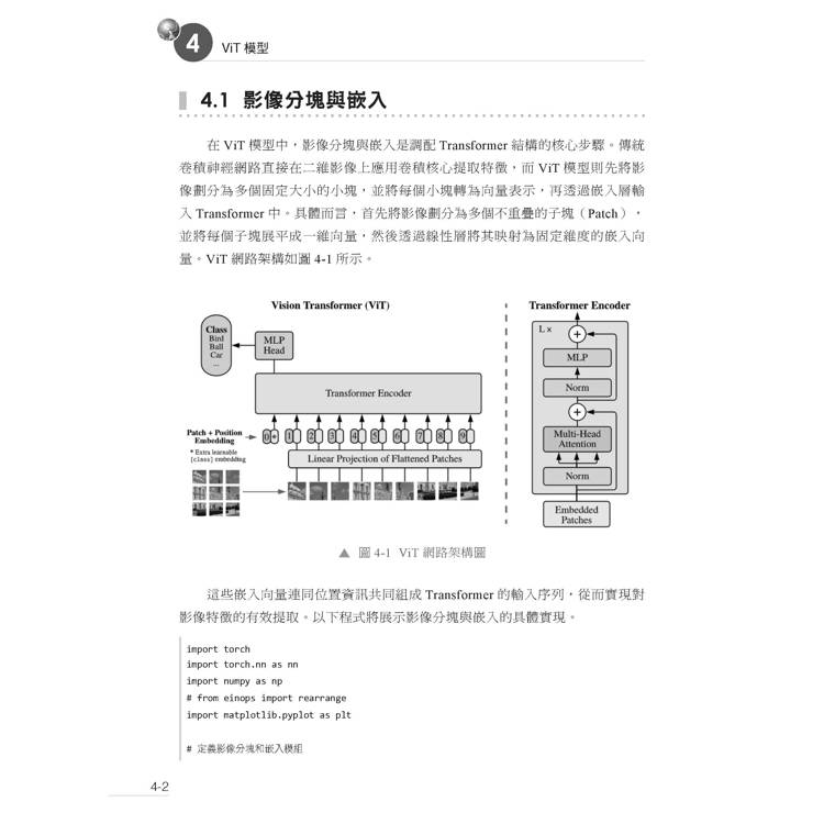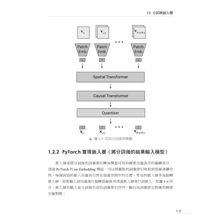 第2~4 章將透過實例深入剖析當前主流的模型。第2 章介紹GPT 模型文字生成的核心原理與實現,包括核心模組、文字生成過程與模型效果評估與調優方法;第3 章介紹BERT 模型的核心實現與訓練,包括模型原理、預訓練任務、模型微調與分類任務;第4 章介紹視覺Transformer 模型的實現,展示其在影像分塊、嵌入及量化分析方面的創新。