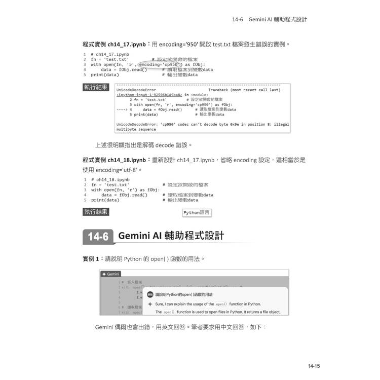 幾乎每章都有「Gemini AI 輔助程式設計」單元,協助: