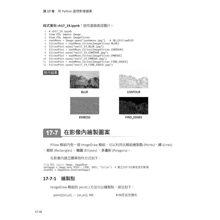 Pillow 影像處理章節(裁切、合成、濾鏡、繪圖、中文字型處理),是 Python 初學者最需要但書籍中最少見的完整範例。