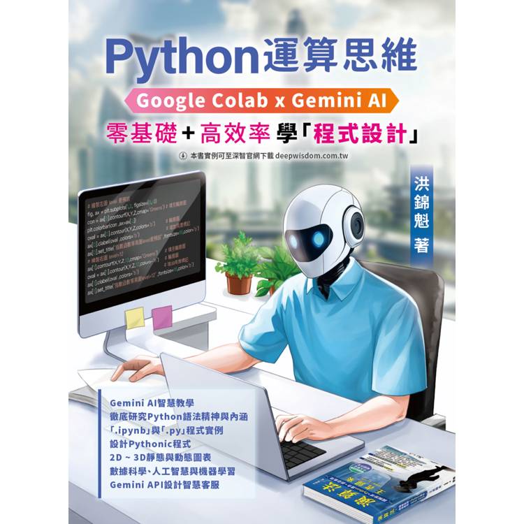 所有程式範例皆提供 Google Colab 的「.ipynb 檔案」與「一般 .py 檔案」兩種版本,讓學習不再受限於環境,輕鬆上雲端、立即執行。希望這本書不僅能成為你學習Python 的起點,也能讓你在與 AI 共學的過程中,看見未來科技的無限可能。