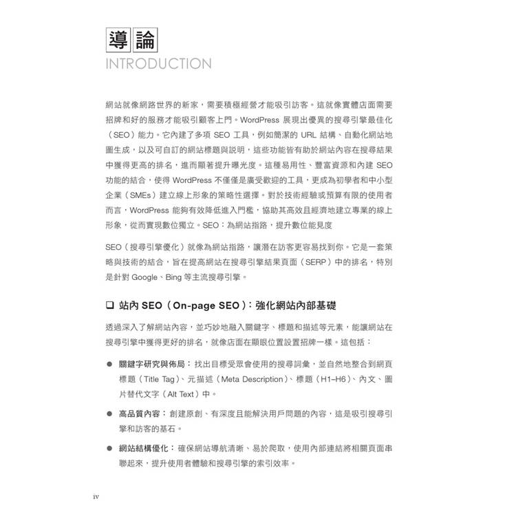 SEO(搜尋引擎最佳化)就像為網站指路,讓潛在訪客更容易找到你。它是一套策略與技術的結合,旨在提升網站在搜尋引擎結果頁面(SERP)中的排名,從而大幅提高曝光與流量。尤其針對 Google、Bing 等主流搜尋引擎,良好的 SEO 不僅帶來能見度,更帶來信任感。本書詳細解說搜尋引擎運作原理、關鍵字研究、網站結構規劃,到內容行銷與外部連結策略,帶你掌握網站成長的核心原則與實際操作流程。無論你是初學者、內容創作者,或剛起步的網站經營者,都能透過本書建立屬於自己的 SEO 經營思維,打造長期穩定的自然流量與內容價值。