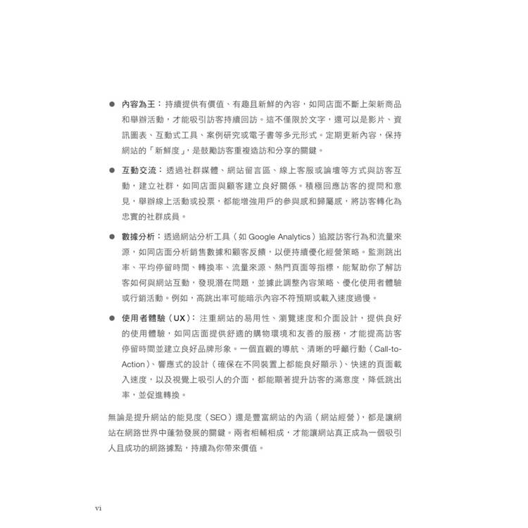 本書以實戰為導向,從 SEO 策略、內容佈局到使用者體驗,帶你建立一個能自我成長、持續創造價値的網站。