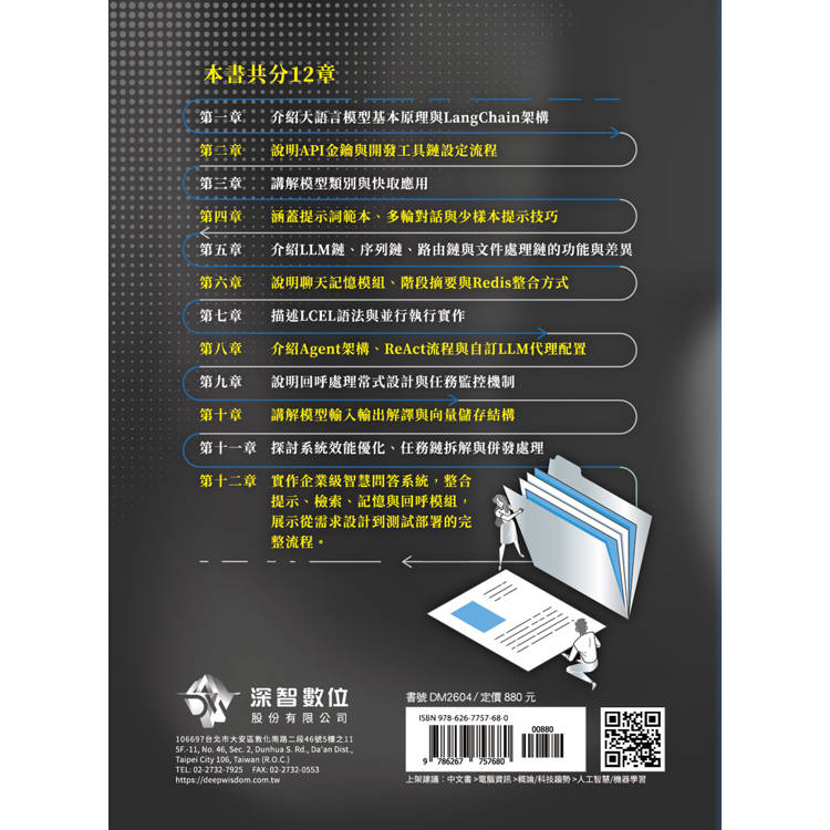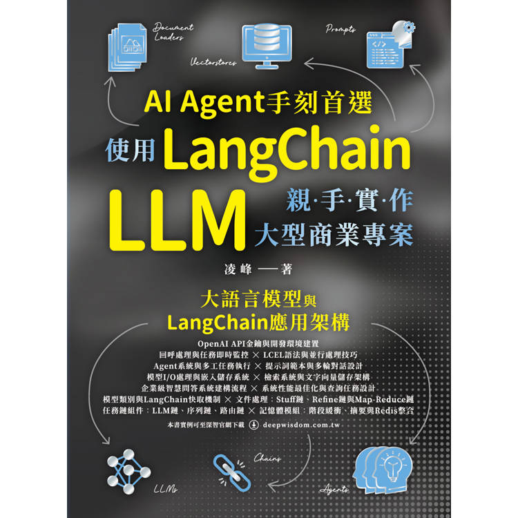 本書共分12章,第一章介紹大語言模型基本原理與LangChain架構;第二章說明API金鑰與開發工具鏈設定流程;第三章講解模型類別與快取應用;第四章涵蓋提示詞範本、多輪對話與少樣本提示技巧;第五章介紹LLM鏈、序列鏈、路由鏈與文件處理鏈的功能與差異;第六章說明聊天記憶模組、階段摘要與Redis整合方式;第七章描述LCEL語法與並行執行實作;第八章介紹Agent架構、ReAct流程與自訂LLM代理配置;第九章說明回呼處理常式設計與任務監控機制;第十章講解模型輸入輸出解譯與向量儲存結構;第十一章探討系統效能優化、任務鏈拆解與併發處理;第十二章實作企業級智慧問答系統,整合提示、檢索、記憶與回呼模組,展示從需求設計到測試部署的完整流程。