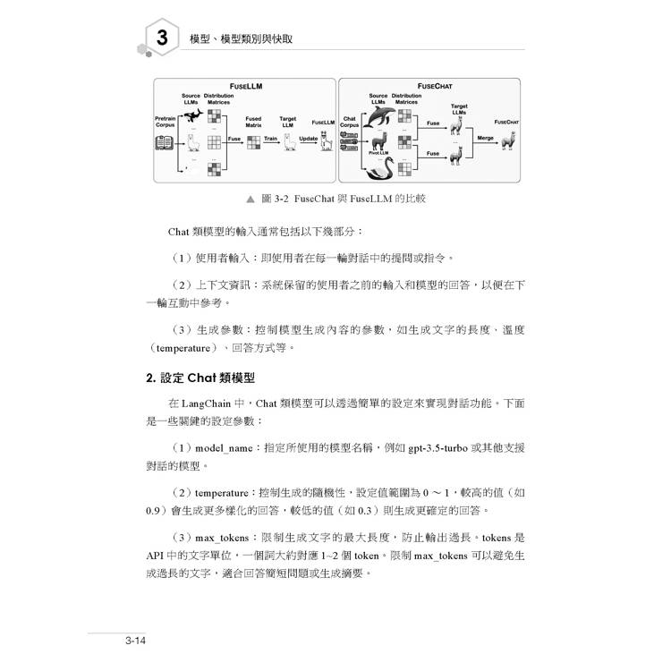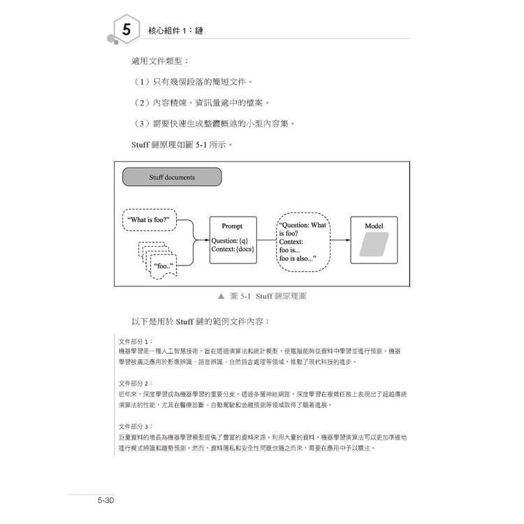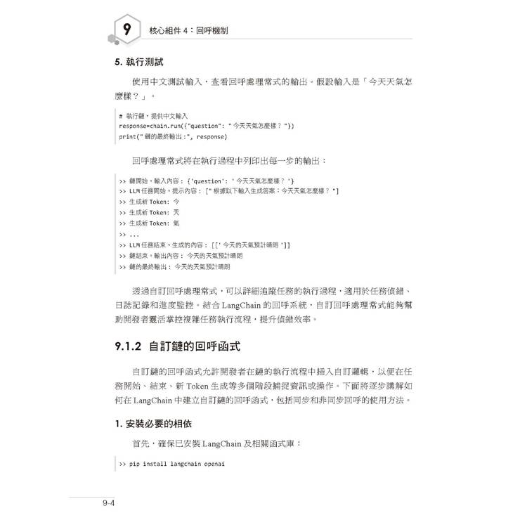 第3~6章逐步帶領讀者了解LangChain的核心元件與功能模組,包括模型匯入、提示詞工程、任務鏈設計和記憶體模組,並透過程式範例來幫助理解與實踐。舉例來說,在提示詞工程部分,讀者將學習如何建構和最佳化Prompt範本,以提升模型輸出的準確性和相關性;在任務鏈設計部分,透過多層鏈式任務的實戰範例,方便讀者掌握應對複雜應用需求的建構與偵錯技巧。