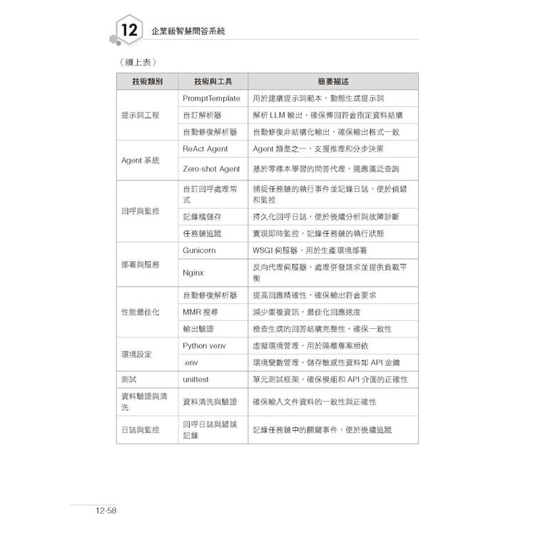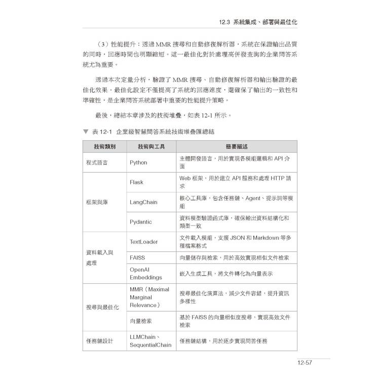 第12章結合前11章的基礎知識,逐步實現一個完整的企業級智慧問答系統。從需求分析、架構設計到程式實現,詳細展示LangChain在企業級應用中的實際實踐過程,幫助讀者在真實應用場景中深入理解和應用LangChain的各種功能模組,滿足多樣化的企業業務需求。