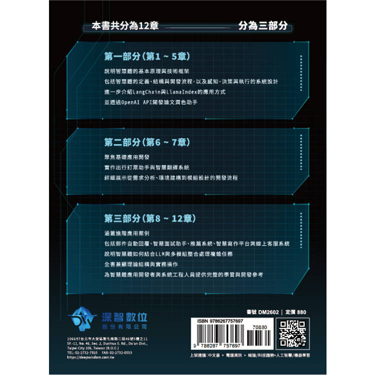 第3 部分(第8 ∼ 12 章)本部分致力於探索更複雜、更專業的智慧體應用場景,透過不同領域的智慧體開發範例,展示如何結合多種技術堆疊,將智慧體的潛力最大化應用於實際業務中。讀者將在本部分中接觸到郵件處理、人才應徵、客製化推薦、寫作幫手和線上客服等多個高度實用的領域,並掌握從開發到部署的全流程技巧。本部分將帶領讀者挑戰更具難度的智慧體系統,實現從簡單邏輯到複雜應用的過渡。