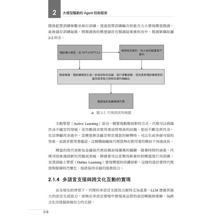 第2 部分(第6、7 章)主要介紹智慧體的初步開發應用,本部分透過兩個實踐案例展示了智慧體的實際應用場景,包括出行訂票智慧體以及智慧翻譯及語言輔助智慧體等。每個案例都提供了從需求分析、技術架構設計到具體實現過程的詳細解讀。這些案例展示了智慧體如何透過LLM 進行語言處理、使用者行為預測和自動化任務執行,並分析了如何針對不同應用場景進行客製化最佳化。