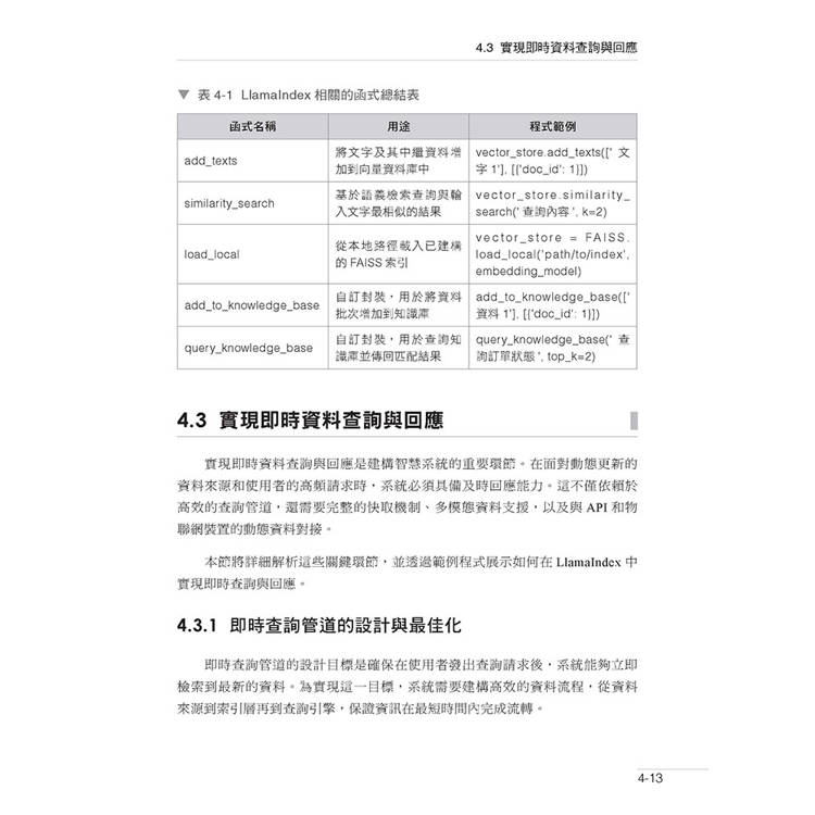 第4 章介紹了LlamaIndex 的架構與索引機制,講解了如何將非結構化資料轉為智慧體的知識庫,並透過即時資料查詢和回應提升系統的智慧化水平。