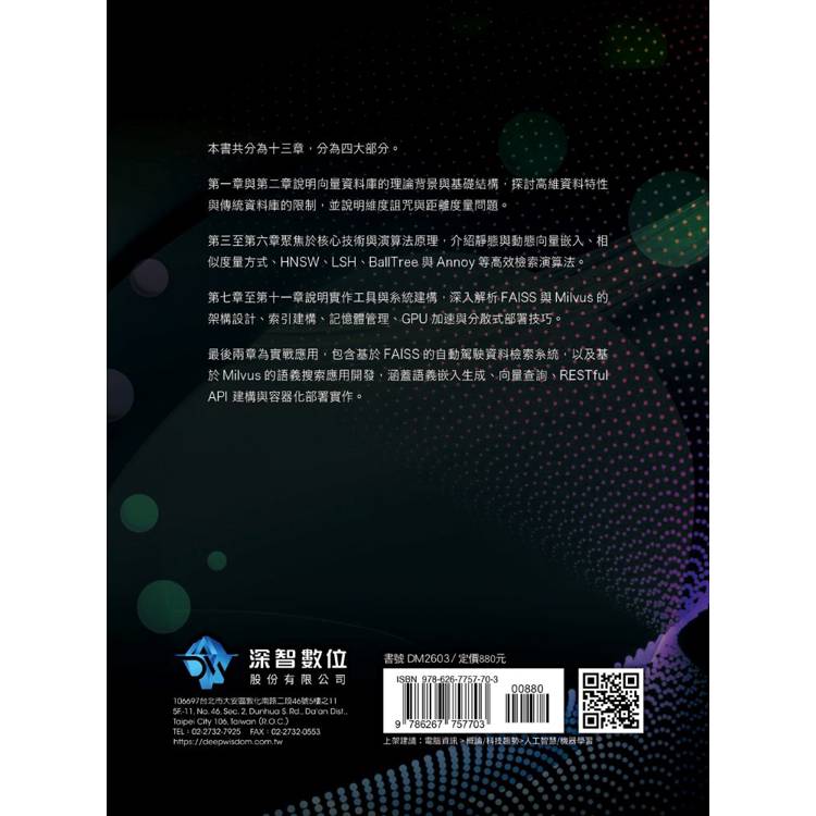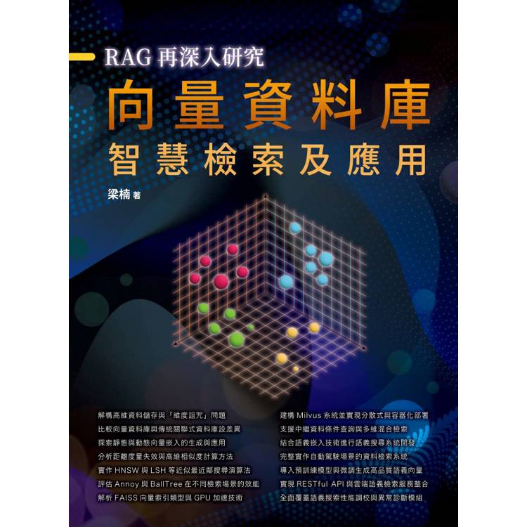 在理論與實踐並重的基礎上,本書還透過豐富的程式範例與詳細的案例剖析,展示了向量資料庫在推薦系統、行為分析和文件檢索等領域的廣泛應用價值。同時針對高性能需求,書中深入解析了GPU 加速、分散式架構與容器化部署等關鍵技術,幫助讀者掌握建構高效、可擴充系統的技能。