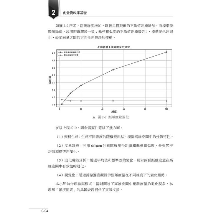 第1 部分:理論基礎。涵蓋第1、2 章,主要專注向量資料庫的理論背景與技術必要性。從高維向量的稀疏性問題、距離度量失效等現象出發,系統分析了傳統資料庫的局限性,並深入探討了向量資料庫在解決高維資料儲存與檢索中的獨特優勢。這部分內容奠定了讀者對向量資料庫核心概念和關鍵技術的理解基礎。