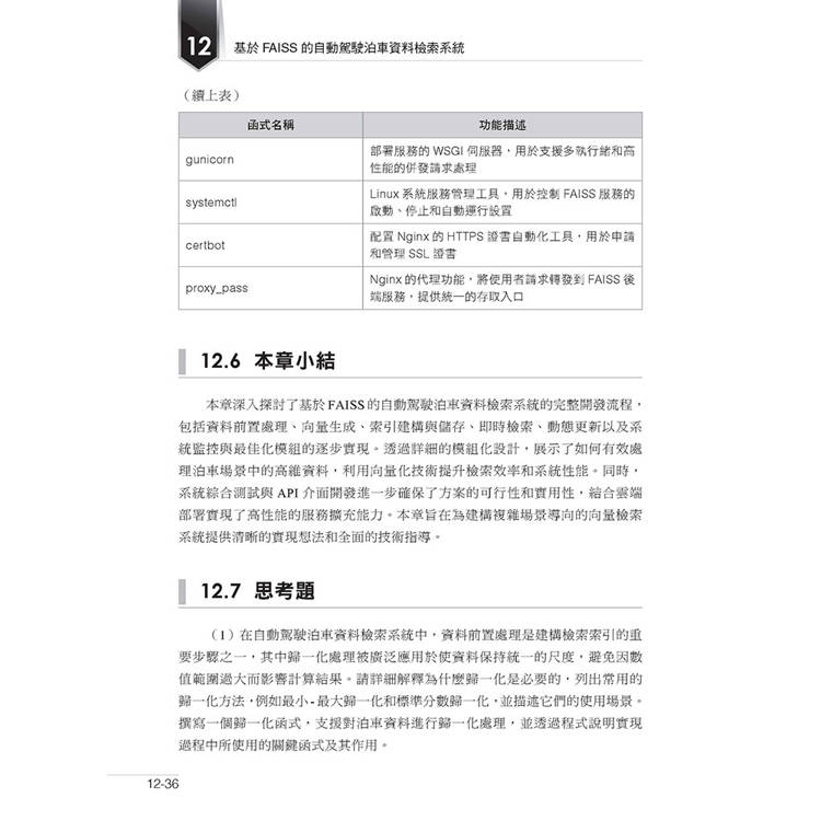 第4 部分:實戰與案例分析。涵蓋第12、13 章,專注向量資料庫的實際應用案例。透過自動駕駛泊車資料檢索系統的完整開發流程,展示向量資料庫的模組化設計與雲端部署能力。此外,本部分深入解析基於語義搜索的開發實戰,涵蓋從語義嵌入生成到企業級語義搜索系統部署的全過程。這部分內容將理論與實踐高度結合,為讀者提供了真實場景的實施指導。