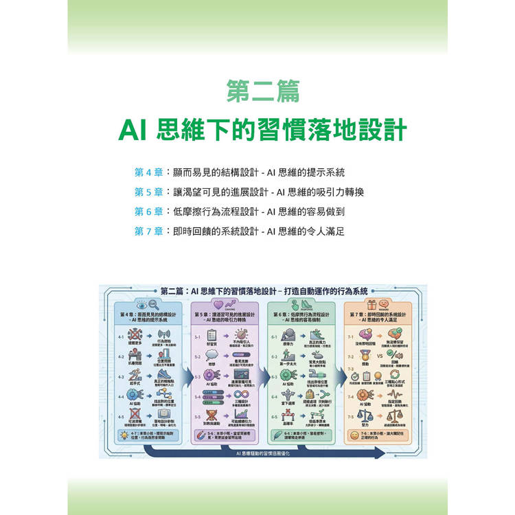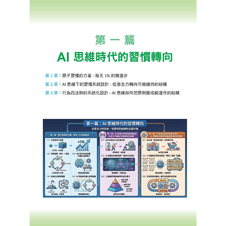 ◎第一篇(1 ~ 3 章)(習慣系統的底層結構):帶你徹底理解「原子習慣」與「行為迴圈」的真正運作方式,並說明 AI 思維為何是強化習慣系統的關鍵,而不是用來監控你。