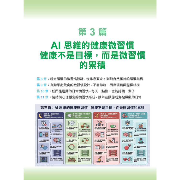 ◎第三篇(8 ~ 11 章)(健康微習慣):睡眠、飲食、運動、情緒,不靠硬撐、不靠紀律,而是用低門檻、可重複的微習慣,讓身體與心理慢慢回到穩定。