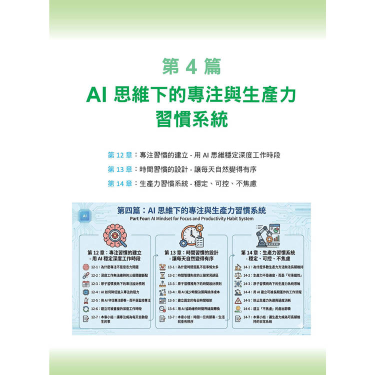 ◎第四篇(12 ~ 14 章)(專注與生產力):不再追求爆發式效率,而是建立「撐得住、不焦慮、可長期產出」的工作節奏,讓 AI 成為節奏守護者,而不是壓力來源。