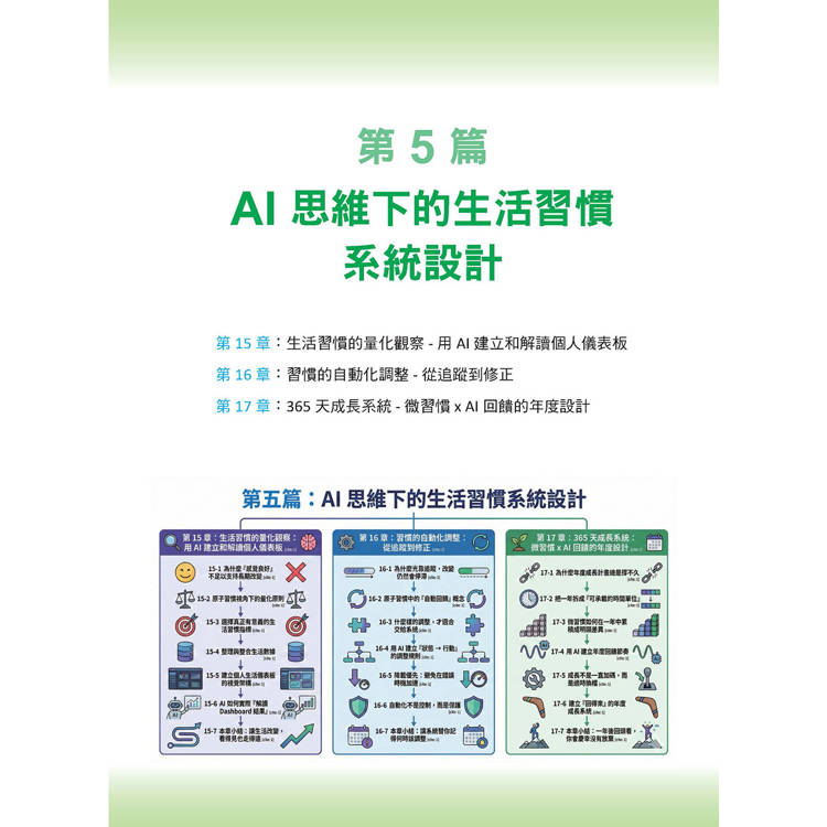 ◎第五篇(15 ~ 17 章)(生活系統與年度成長):教你如何用 AI 建立個人儀表板、解讀狀態、進行自動調整,最終形成一套 365 天走得完、回得來、不容易崩盤的成長系統。