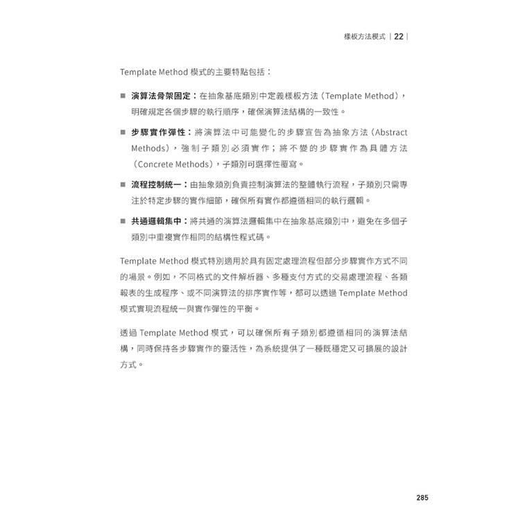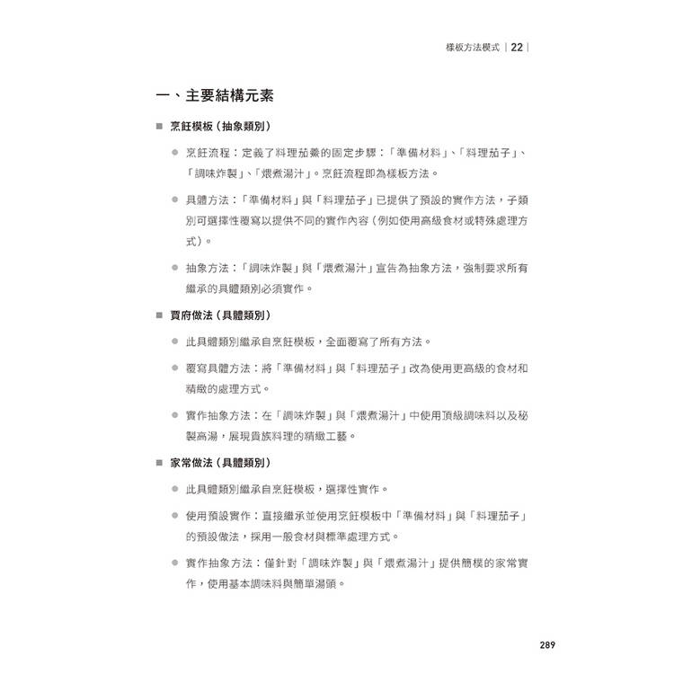 隨後,透過結構型與協作型設計模式,本書進一步探討:當系統規模逐漸擴大、物件數量持續增加時,如何避免結構僵化、責任混亂與相互牽連,而仍能維持清晰的組織邊界與彈性的合作關係。這些模式並非零散的技巧集合,而是一套用來組織軟體、控制變動、支撐長期演進的設計技藝。