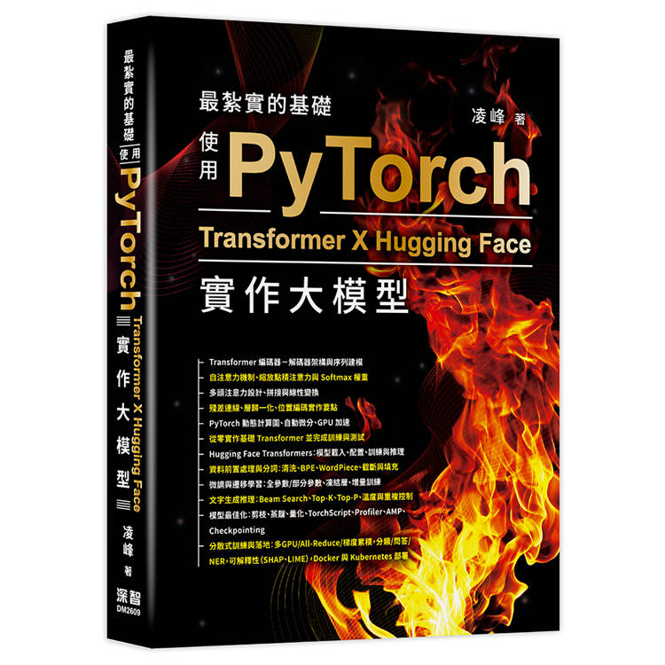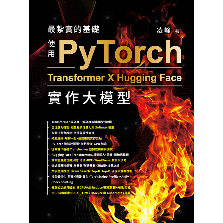 本書以Transformer為主線,從PyTorch實作到Hugging Face預訓練模型訓練與微調,依序整理資料前置處理、分詞(BPE、WordPiece)、生成推理(Beam Search、Top-K、Top-P)、模型最佳化(剪枝、蒸餾、量化、TorchScript、Profiler)、混合精度與多GPU分散式訓練,並以分類、問答、命名實體辨識等NLP任務貫穿,最後完成智慧文字分析平臺的容器化與雲端部署。內容以可執行範例串接關鍵機制,適合大模型開發與NLP研發人員作為實作導向的參考。