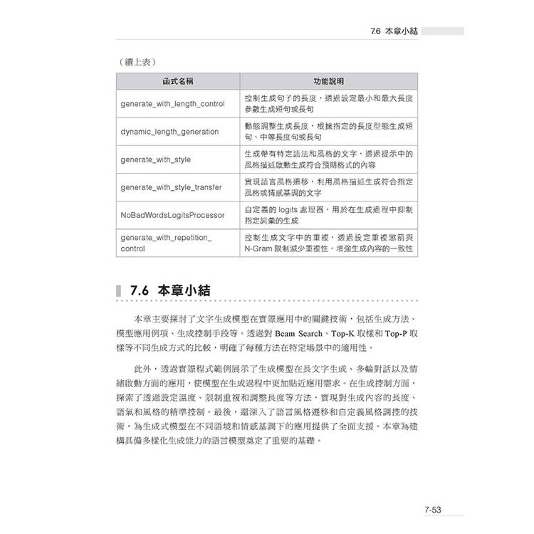 該部分內容詳細介紹了生成模型的推理方法,包括Beam Search、Top-K 取樣和Top-P 取樣等(第7 章),讓讀者能夠靈活控制生成模型的輸出效果。接著,介紹了模型最佳化技術,如模型量化和剪枝、模型最佳化和測試、混合精度訓練(第8 章),以及多GPU 並行處理和分散式訓練的實現(第9 章),幫助讀者提升大模型在推理和訓練中的效率。