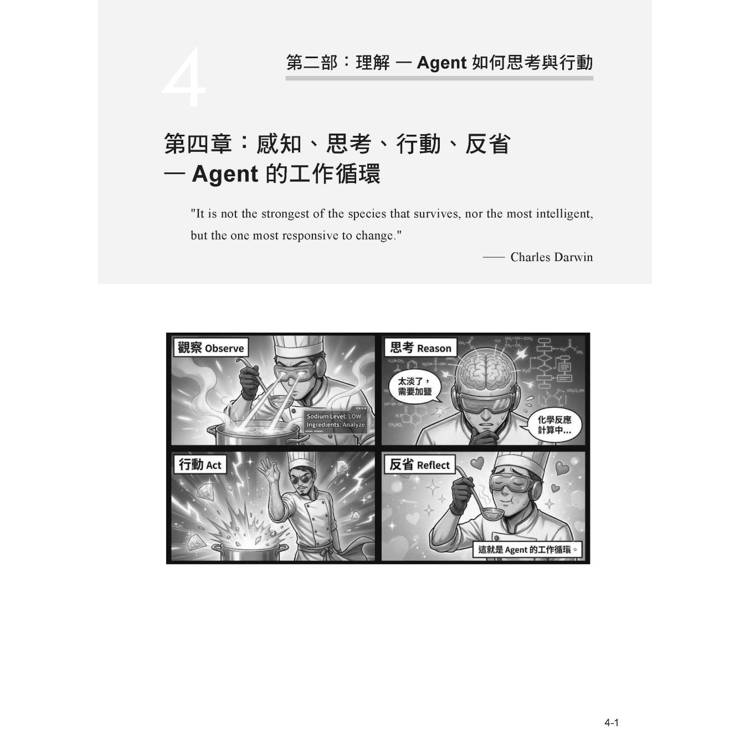 第二部「理解」會深入 Agent 的運作方式。我們會探討它怎麼思考(感知-思考-行動-反省的循環)、怎麼記住你說過的話(記憶系統)、怎麼使用各種工具來完成任務(工具調用)、以及多個 Agent 如何團隊合作。