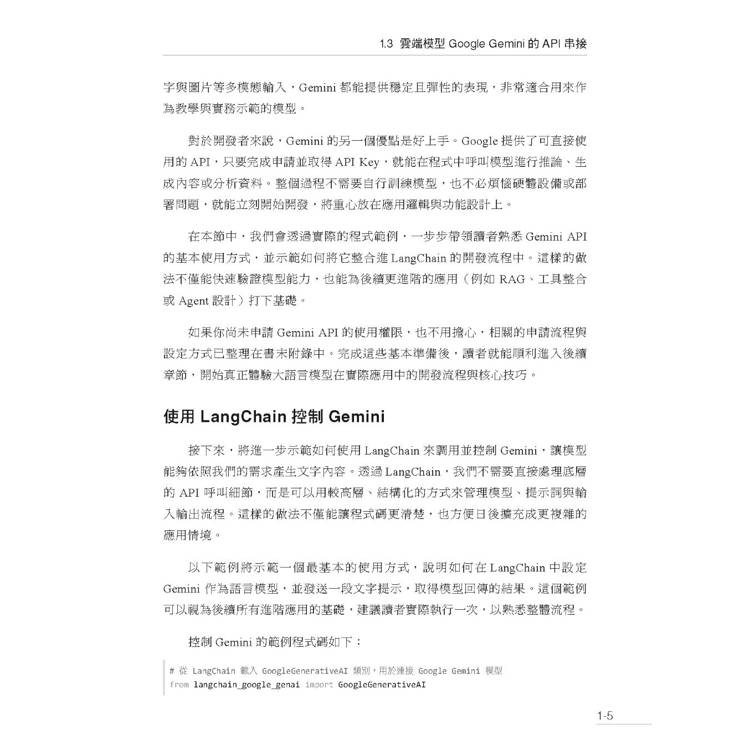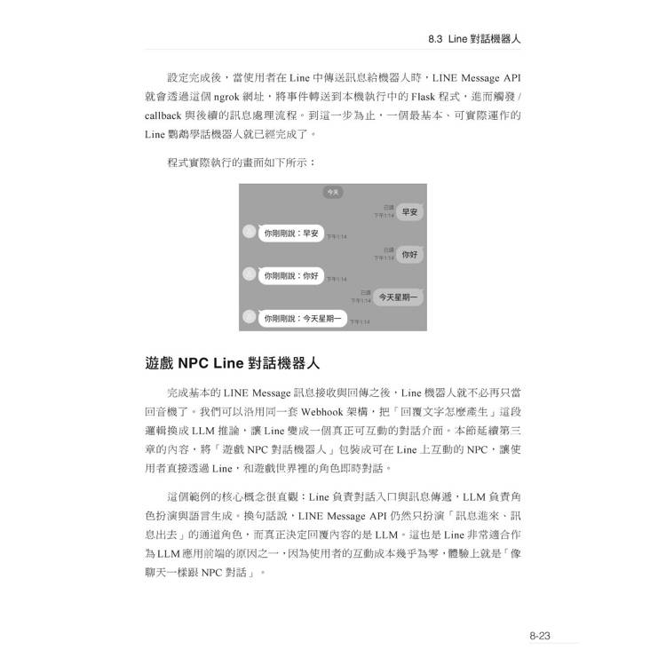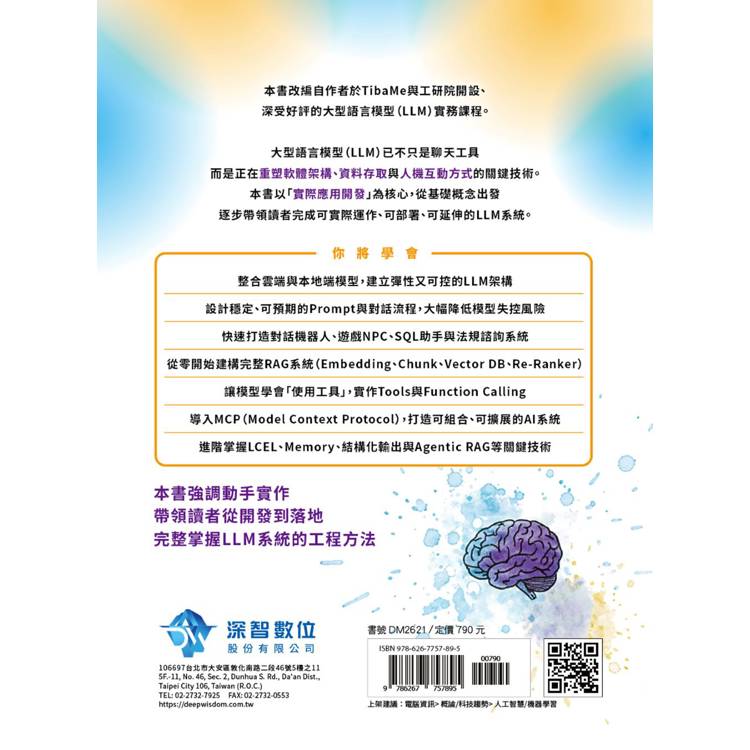 因此,本書的重點並不放在LLM的模型原理、數學推導、架構設計或訓練流程,而是聚焦於 「如何使用LLM解決實際問題」。書中將從應用開發的角度出發,帶領讀者理解如何串接雲端與本地端模型、如何設計對話與Prompt結構、如何讓模型存取外部資料、使用工具,以及如何建構可部署、可擴充的完整LLM系統。