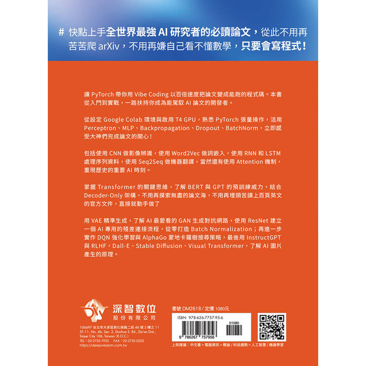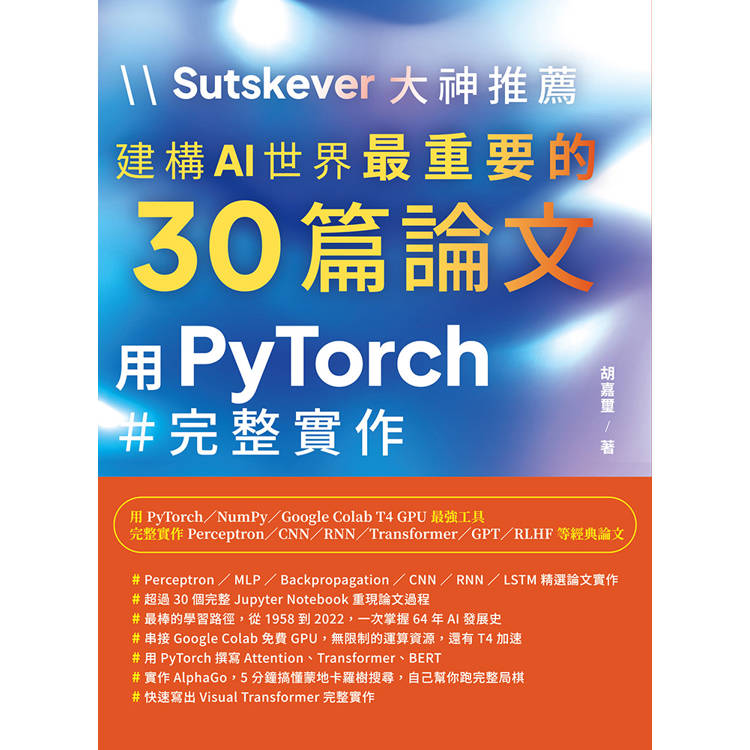 快點上手全世界最強 AI 研究者的必讀論文,從此不用再苦苦爬 arXiv,不用再嫌自己看不懂數學,只要會寫程式。讓 PyTorch 帶你用 Vibe Coding 以百倍速度把論文變成能跑的程式碼。本書從入門到實戰,一路扶持你成為能駕馭 AI 論文的開發者。