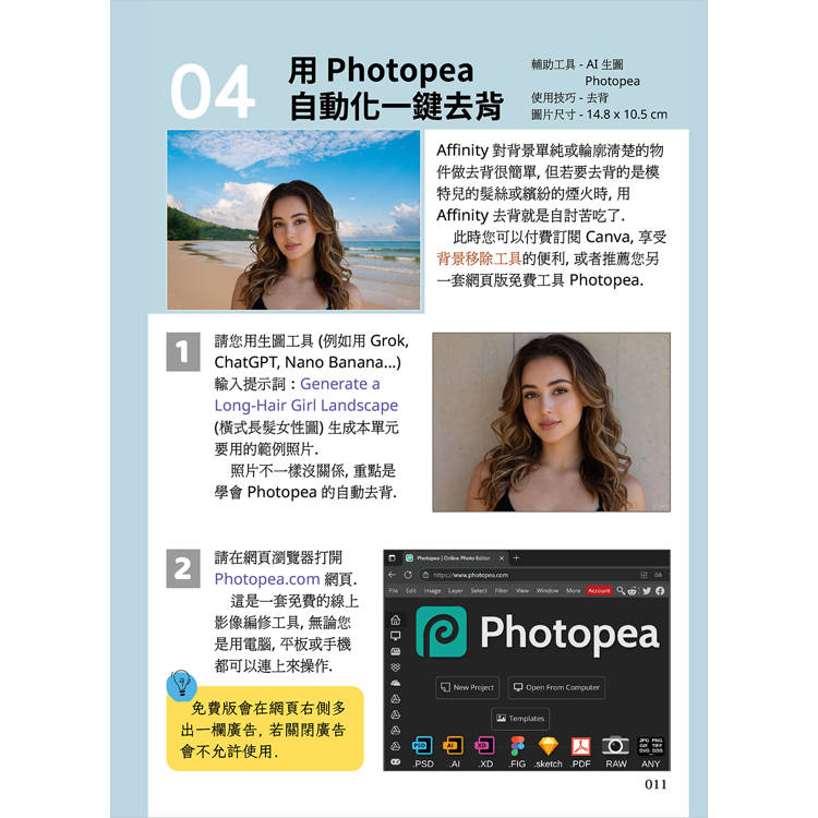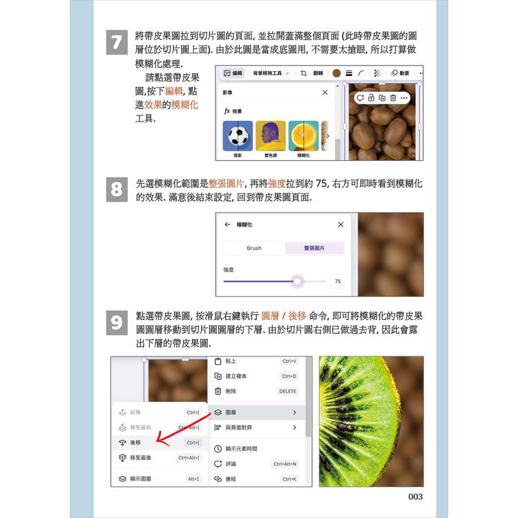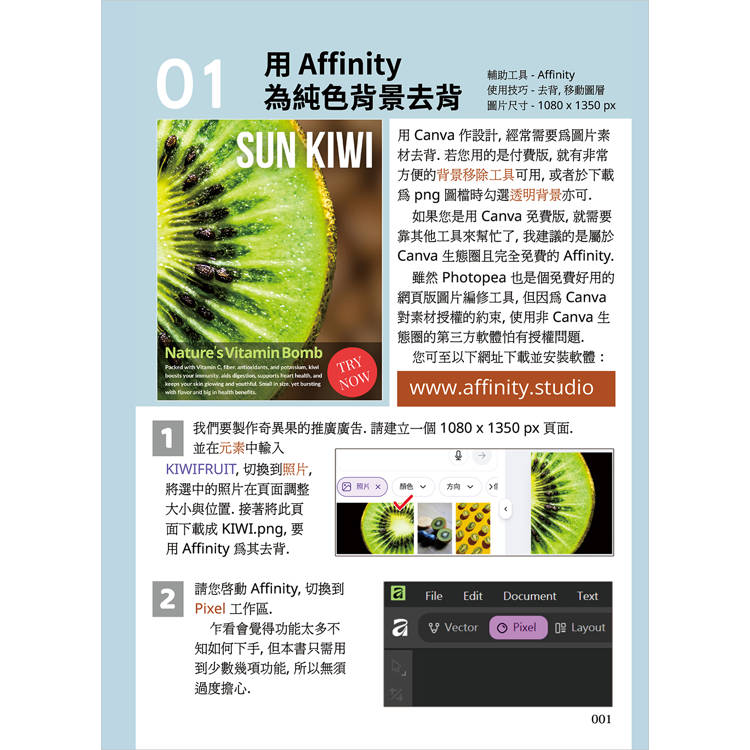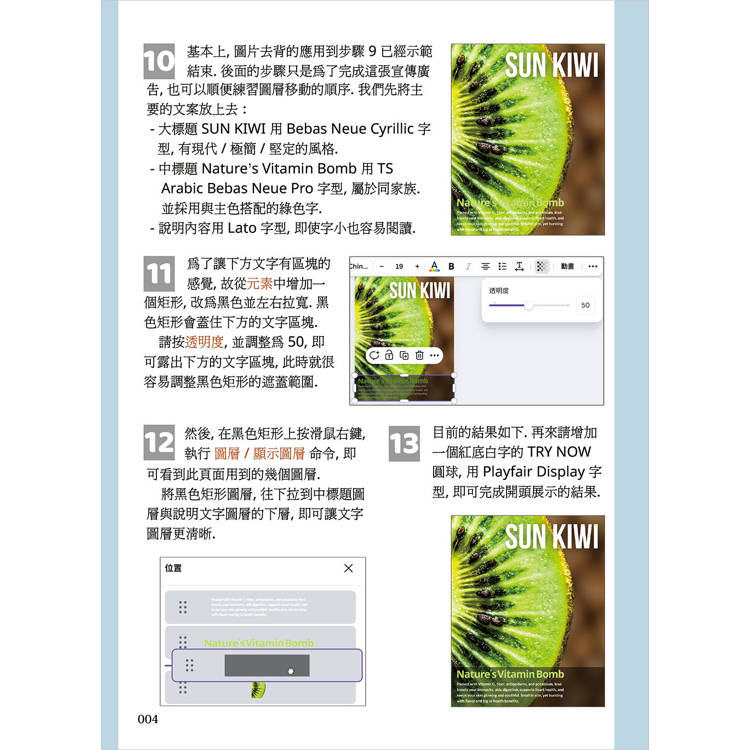 我看過許多 Canva 網路教學影片以及入門書籍,看起來確實講了很多技巧,但還是不知道可以怎麼用、用在哪裡? 這本《Canva 實用點子爆米花》就是我走過的路,期望讀者從「照著做」開始,到「做出自己的東西」。本書為了照顧尚未訂閱 Canva 的免費使用者,在範例中使用到的照片、圖像、視訊,都是免費版可以從元素庫中找到的。 此外,為考量讀者閱讀上的辛苦,本書特別將內文字體放大, 儘可能讓讀者在不過度消耗眼力的情況下閱讀。